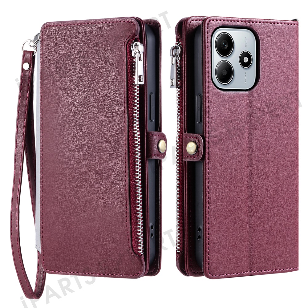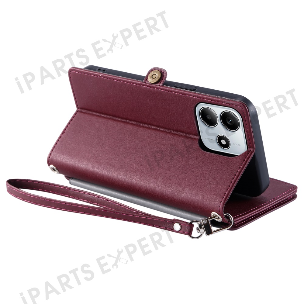 015 Style For Xiaomi Redmi Note 14 5G Case TPU+PU Leather Wallet Phone Cover with Straps - Wine Red