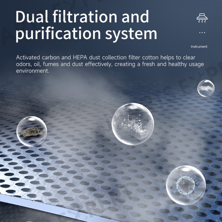 - 【Dual Filtration and Purification System】 Activated carbon and HEPA dust collection filter cotton help to clear odors, oil, fumes, and dust effectively, creating a fresh and healthy usage environment