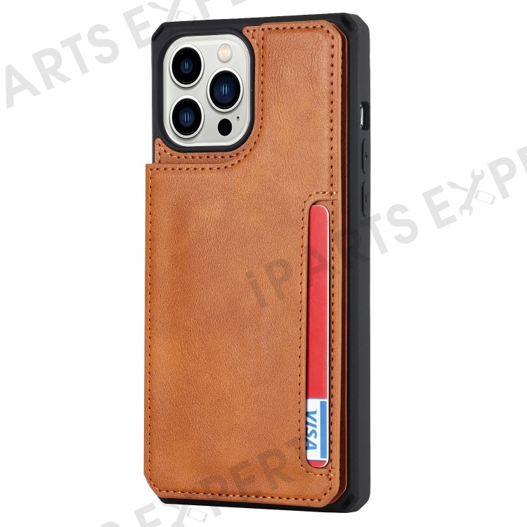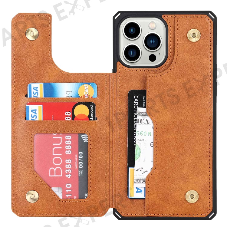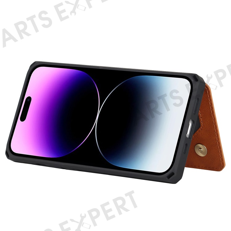 Anti-dust PU Leather Coated TPU Phone Case for iPhone 14 Pro, Magnetic Snap Button Wallet Phone Cover Kickstand Phone Shell - Light Brown