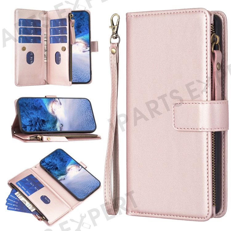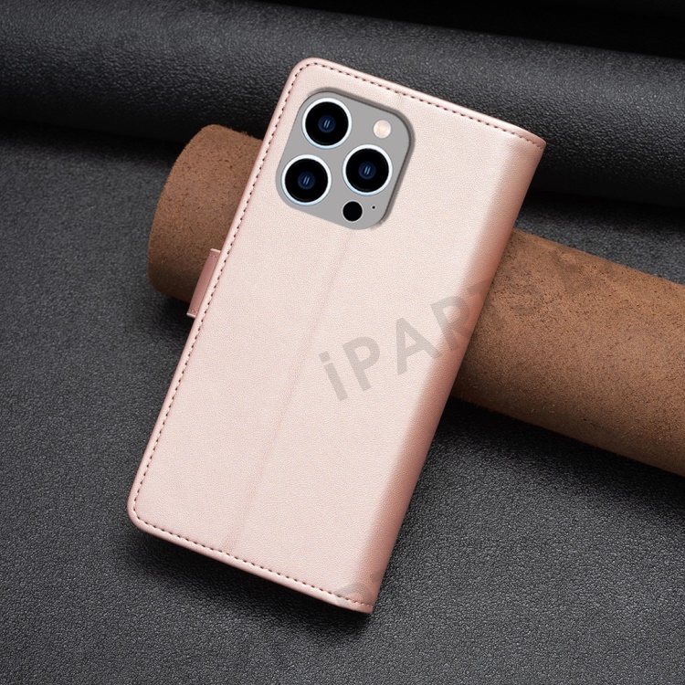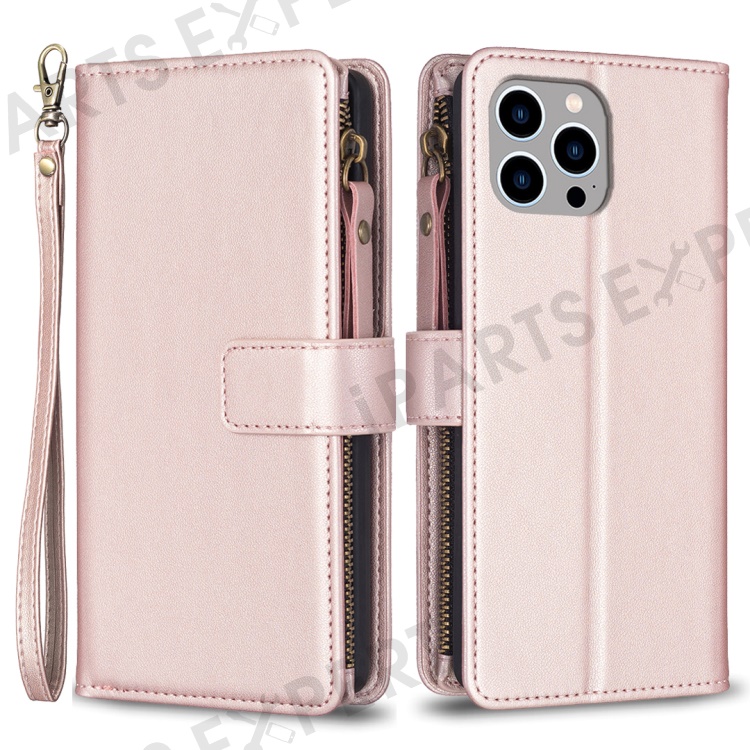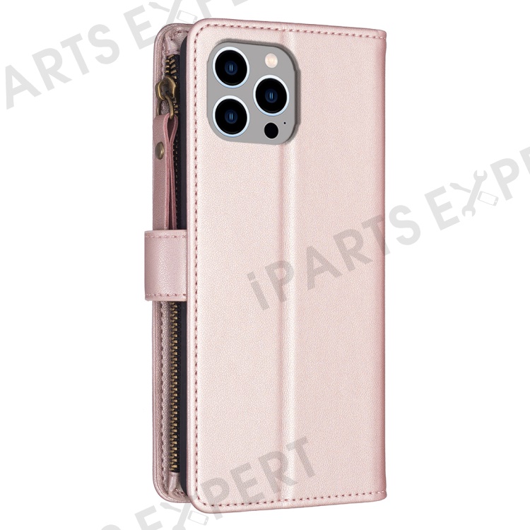 BF Style-19 For iPhone 15 Pro Max PU Leather Phone Case Flip Wallet Stand Cover with Zipper Pocket - Rose Gold