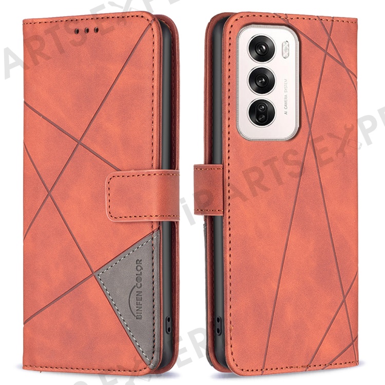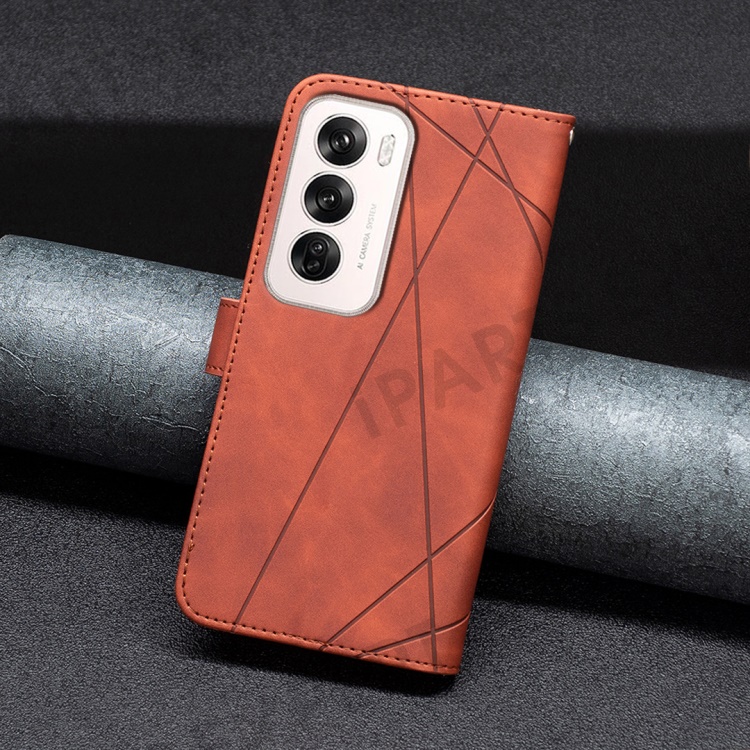 BINFEN COLOR For Oppo Reno12 5G (Global) Phone Cases Wallet Stand Geometry Imprint Leather Cover - Brown