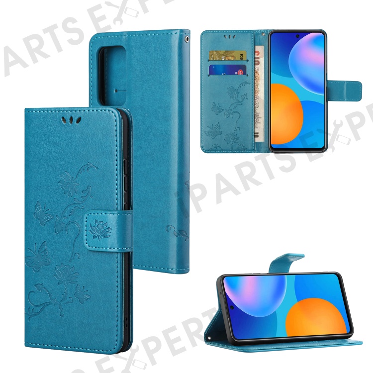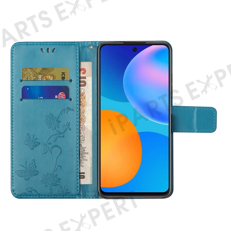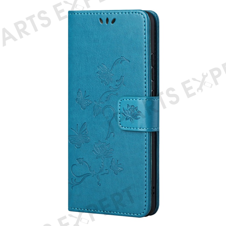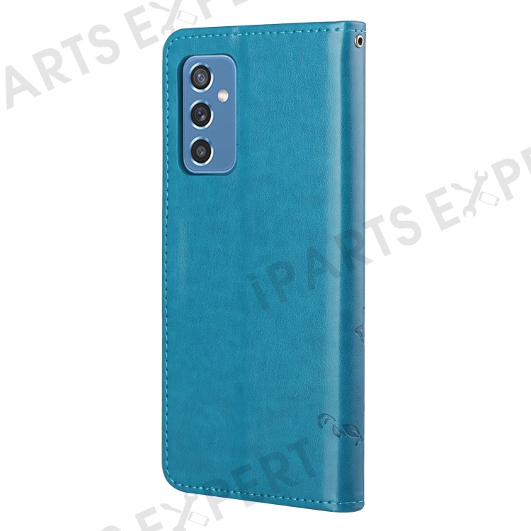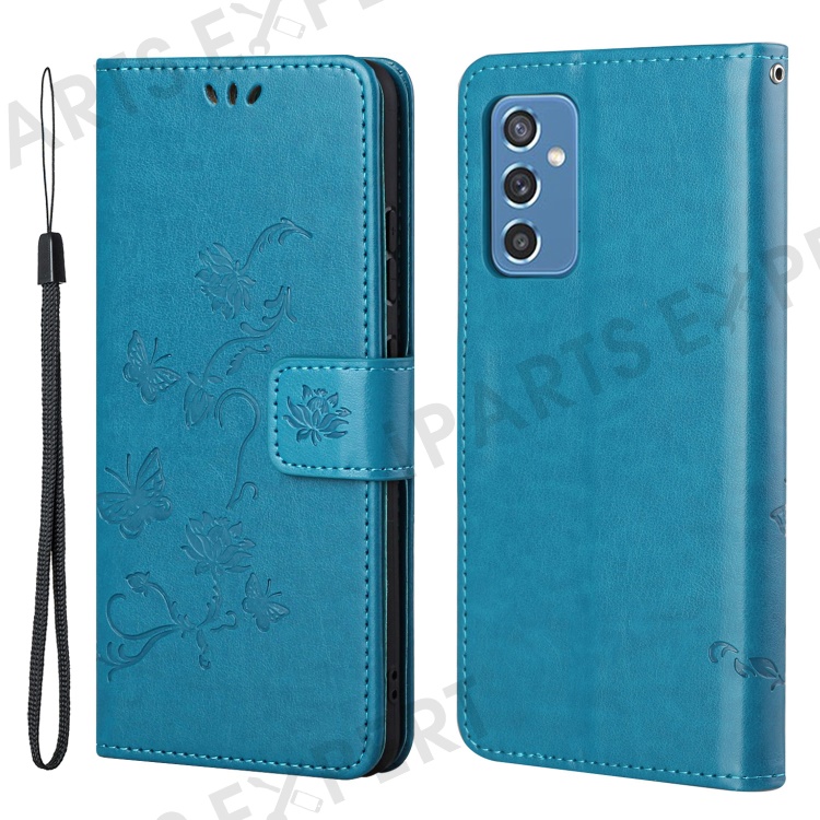 Butterfly Flower Imprinting Anti-Scratch Anti-Drop Leather Phone Wallet Stand Cover with Strap for Samsung Galaxy M52 5G - Blue