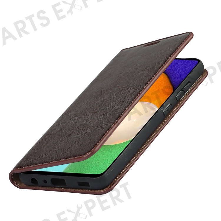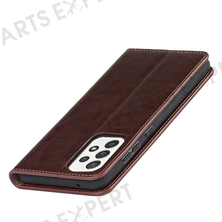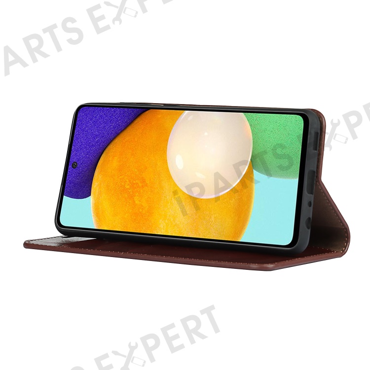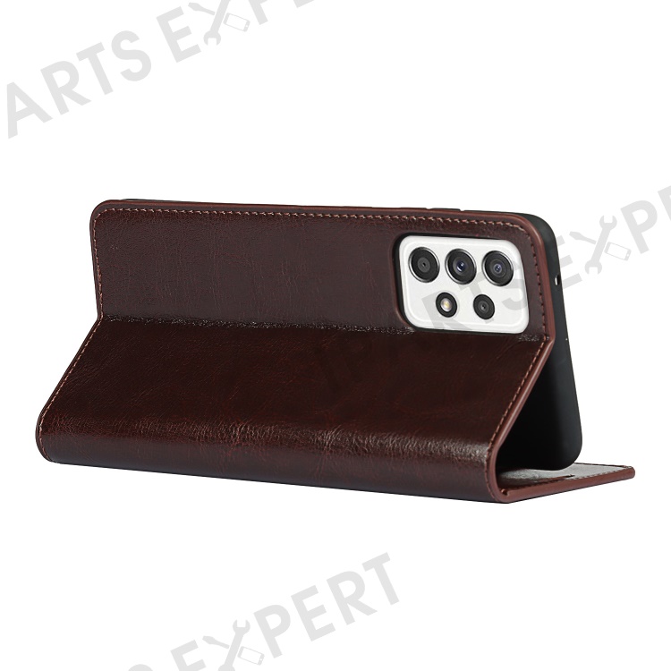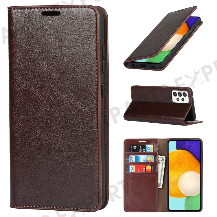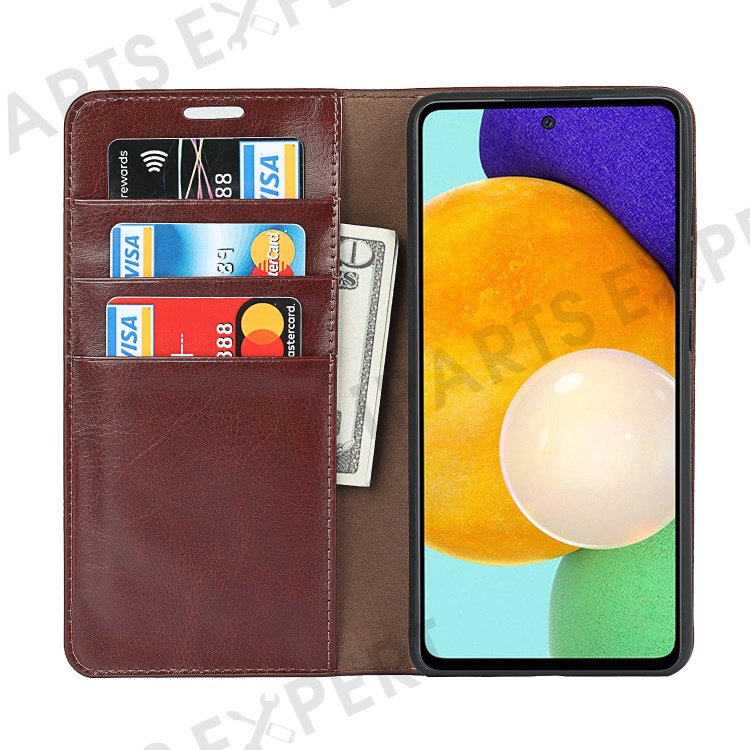 Crazy Horse Skin Genuine Leather Wallet Phone Case with Stand for Samsung Galaxy A52 4G/5G / A52s 5G - Coffee