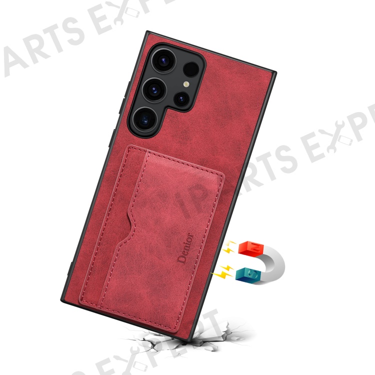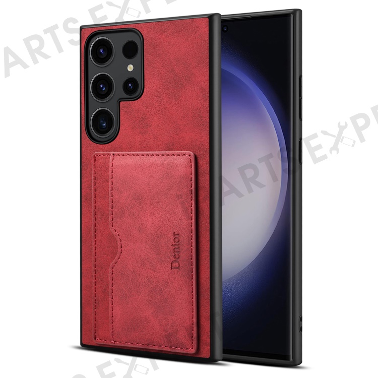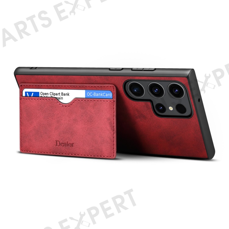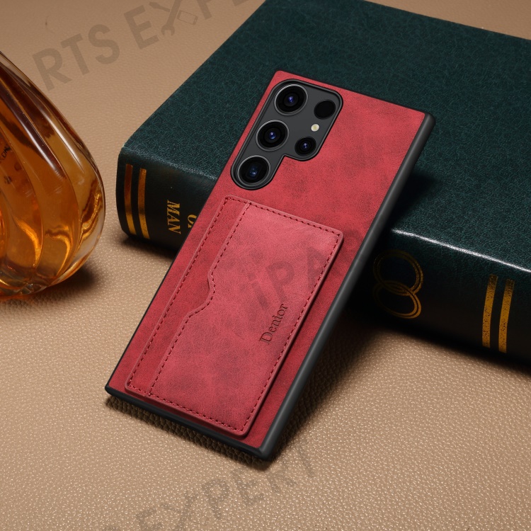DENIOR For Samsung Galaxy S23 Ultra Magnetic Case Retro Card Holder Kickstand Back Shell - Red