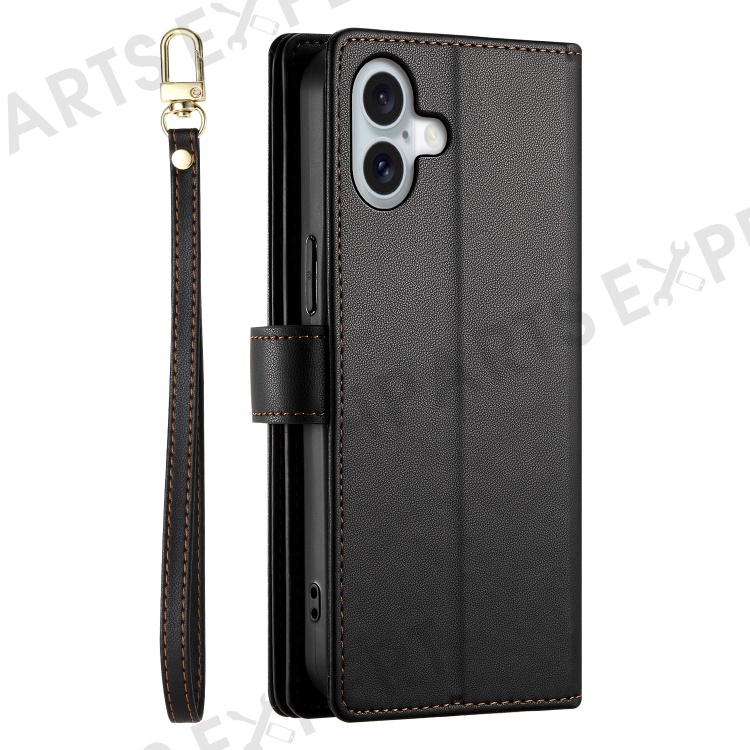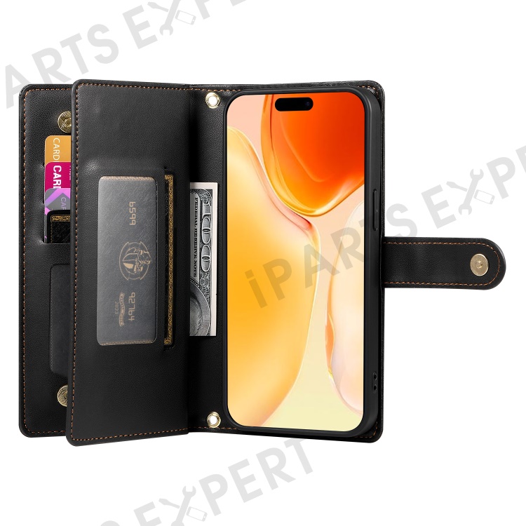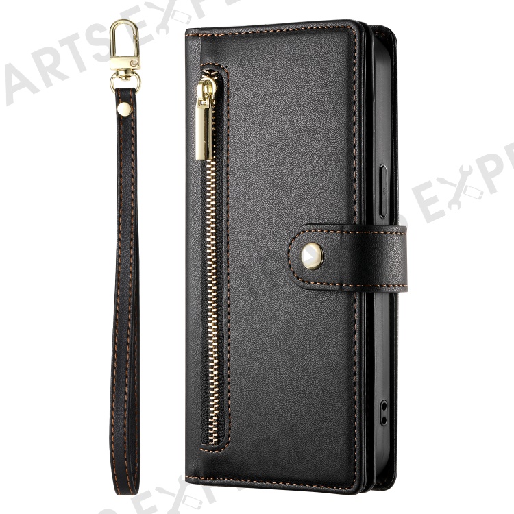 DF-011 For iPhone 16 Plus Case Zipper Pocket Leather Wallet Phone Cover with Straps - Black