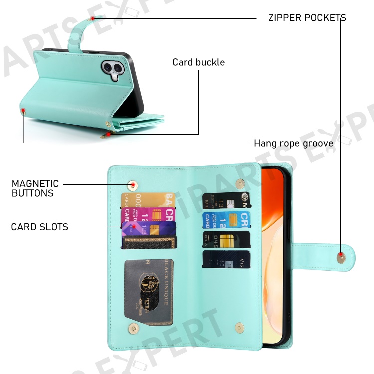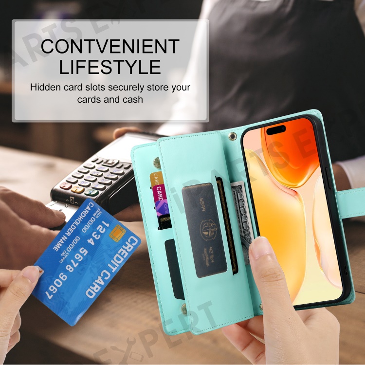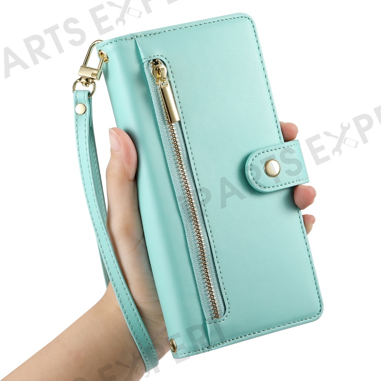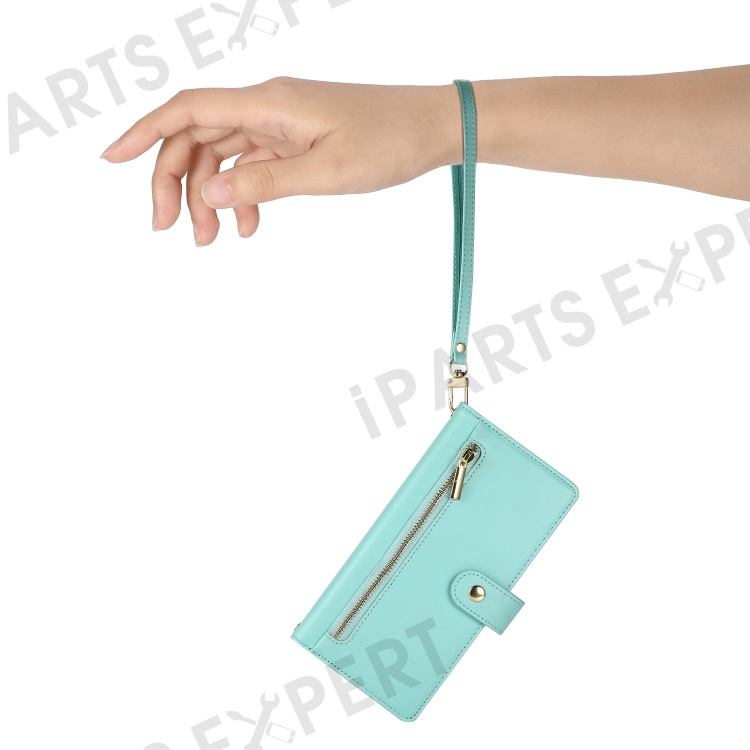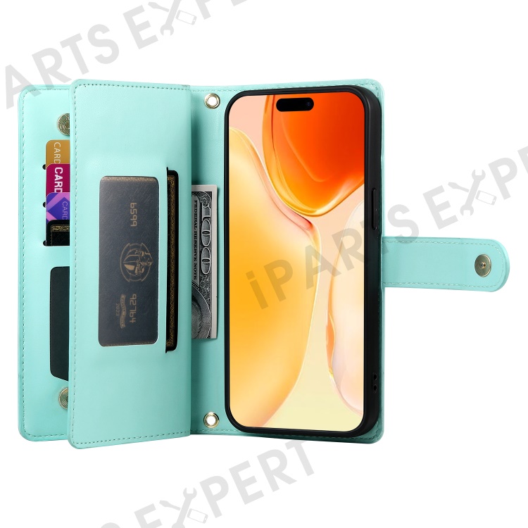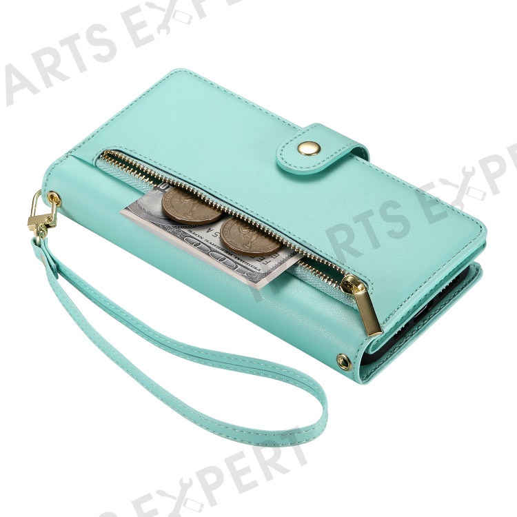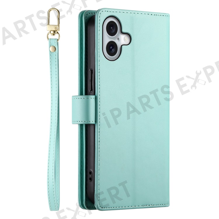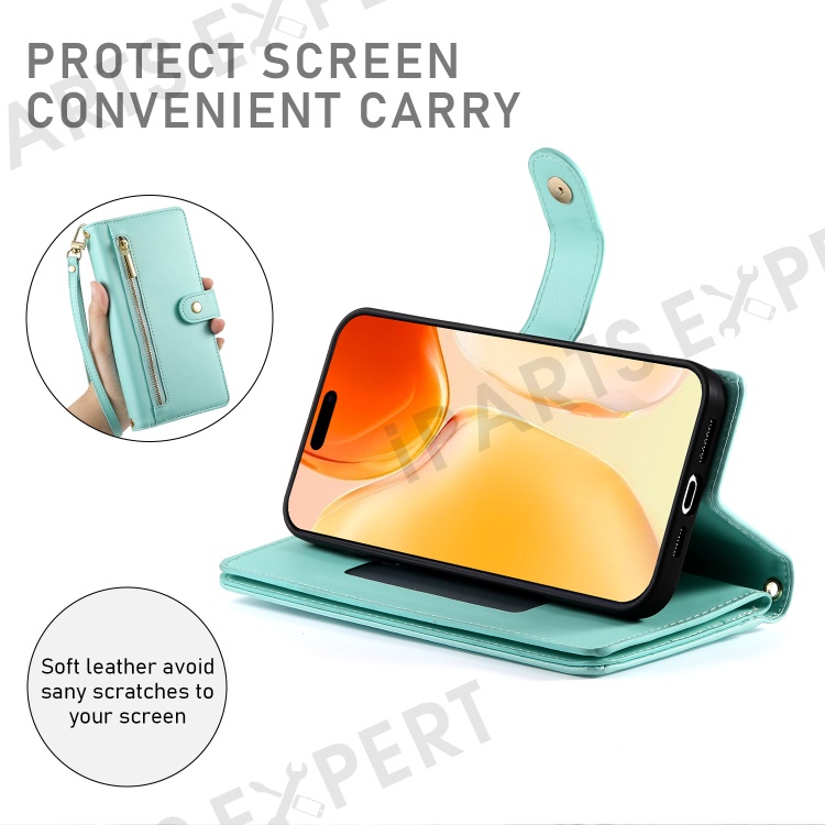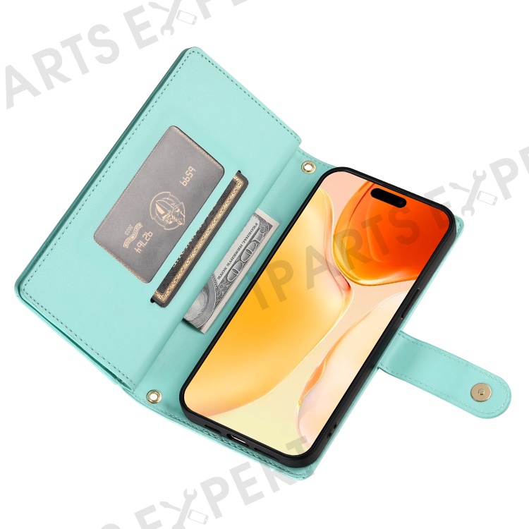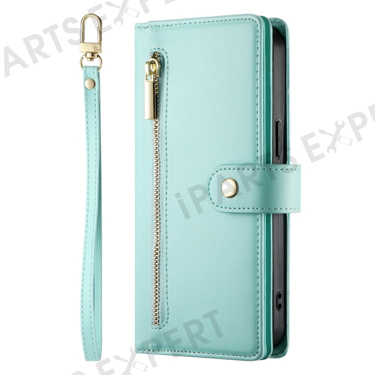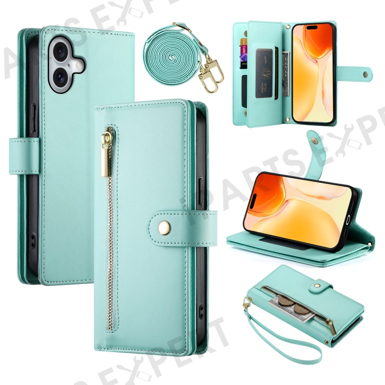 DF-011 For iPhone 16 Plus Case Zipper Pocket Leather Wallet Phone Cover with Straps - Mint Green