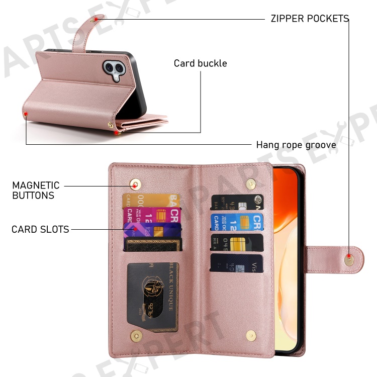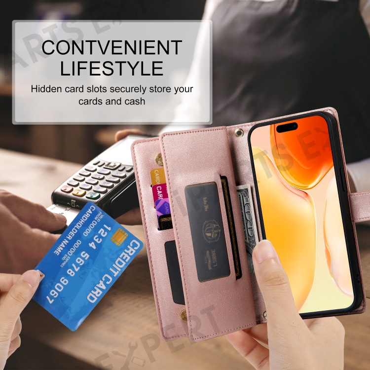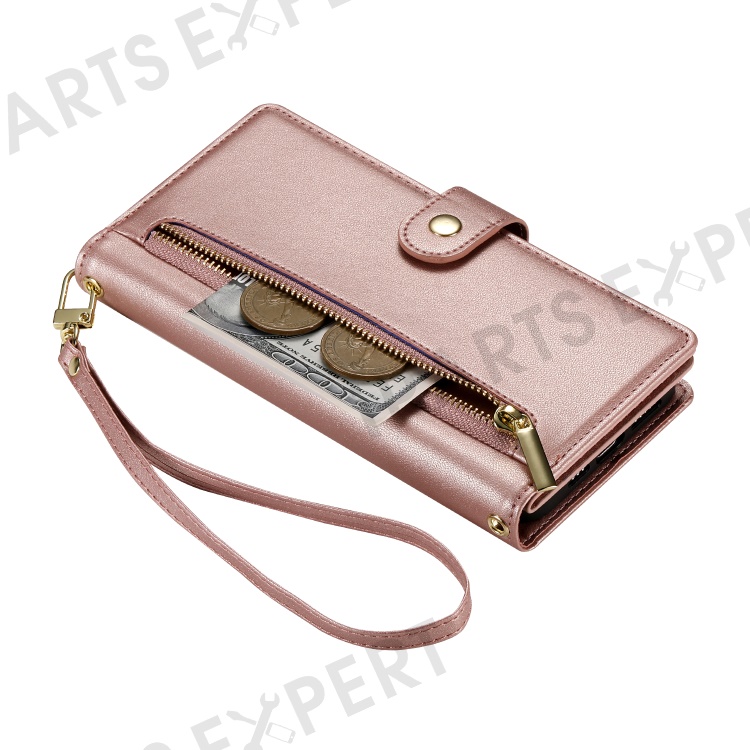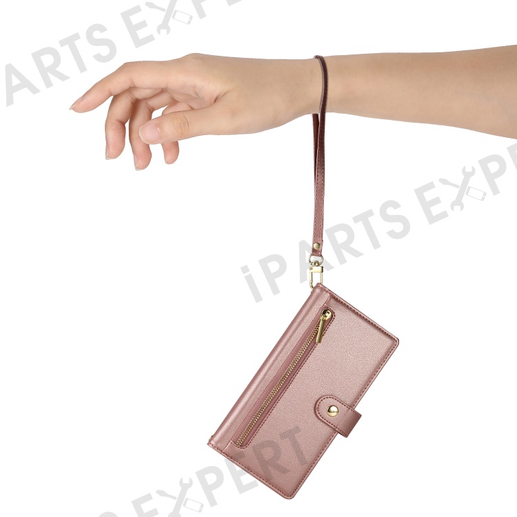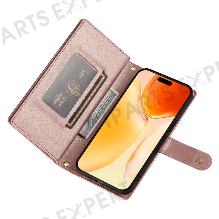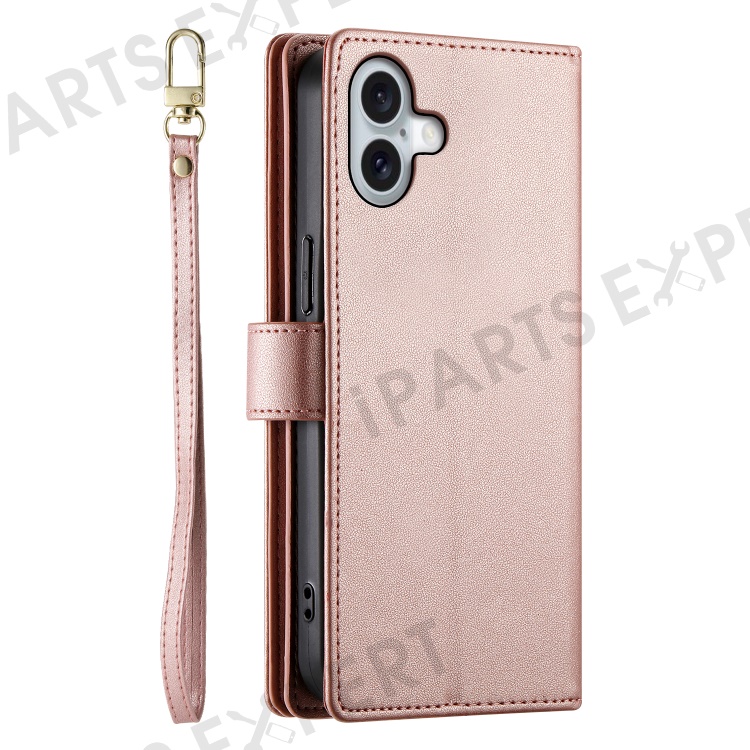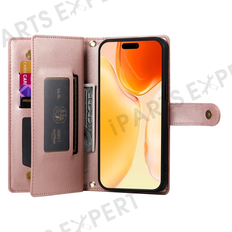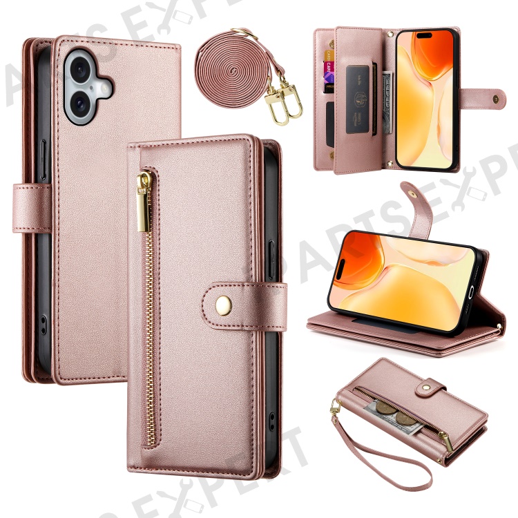 DF-011 For iPhone 16 Plus Case Zipper Pocket Leather Wallet Phone Cover with Straps - Pink