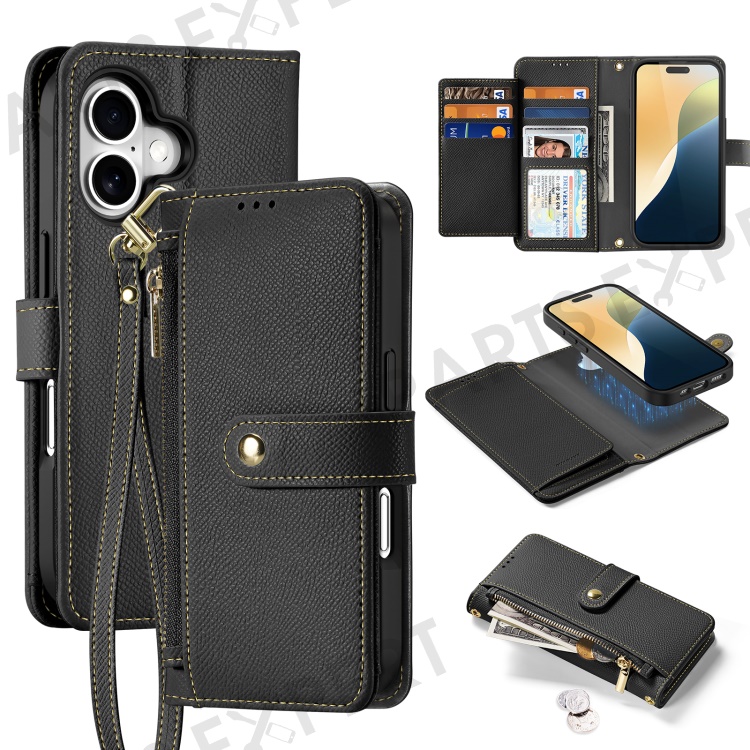DUX DUCIS Lawa Series for iPhone 16 Magnetic Case Detachable Zipper Wallet Cowhide Leather Cover - Black