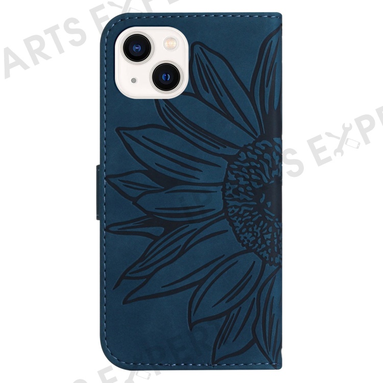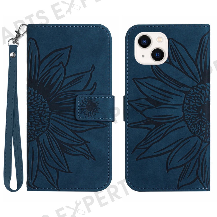 Flip Phone Case for iPhone 14, HT04 Imprinted Sunflower Adjustable Stand PU Leather Skin-Touch Magnetic Wallet Cover with Strap - Dark Blue