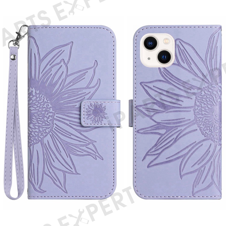 Flip Phone Case for iPhone 14, HT04 Imprinted Sunflower Adjustable Stand PU Leather Skin-Touch Magnetic Wallet Cover with Strap - Light Purple