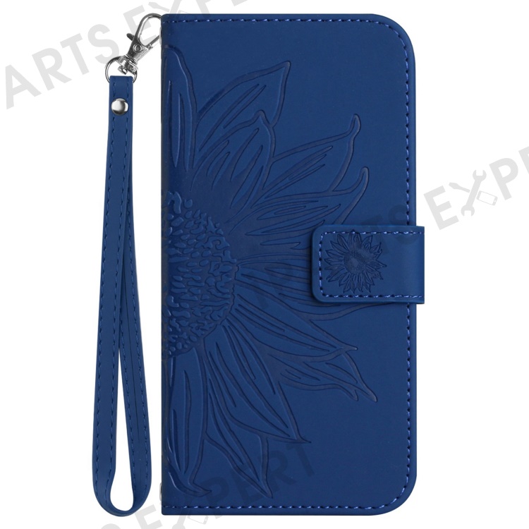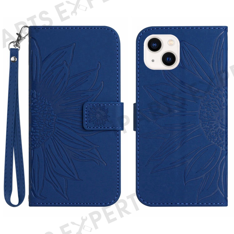 Flip Phone Case for iPhone 14, HT04 Imprinted Sunflower Adjustable Stand PU Leather Skin-Touch Magnetic Wallet Cover with Strap - Sapphire