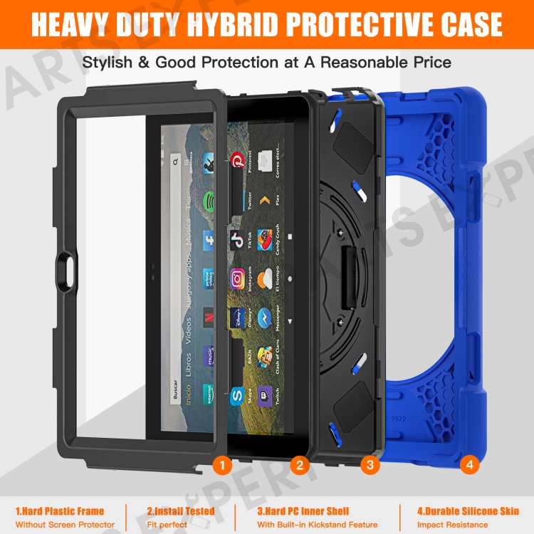 For Amazon Fire HD 8 (2022) / HD 8 (2024) Kickstand PC + Silicone Tablet Case 360 Degree Rotation Hand Strap Drop Resistant Rugged Protective Cover - Blue