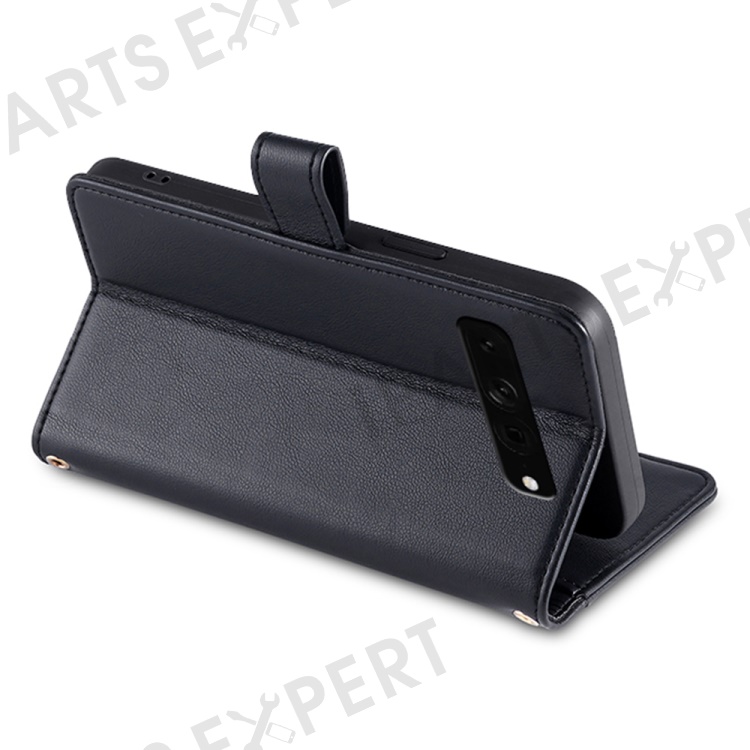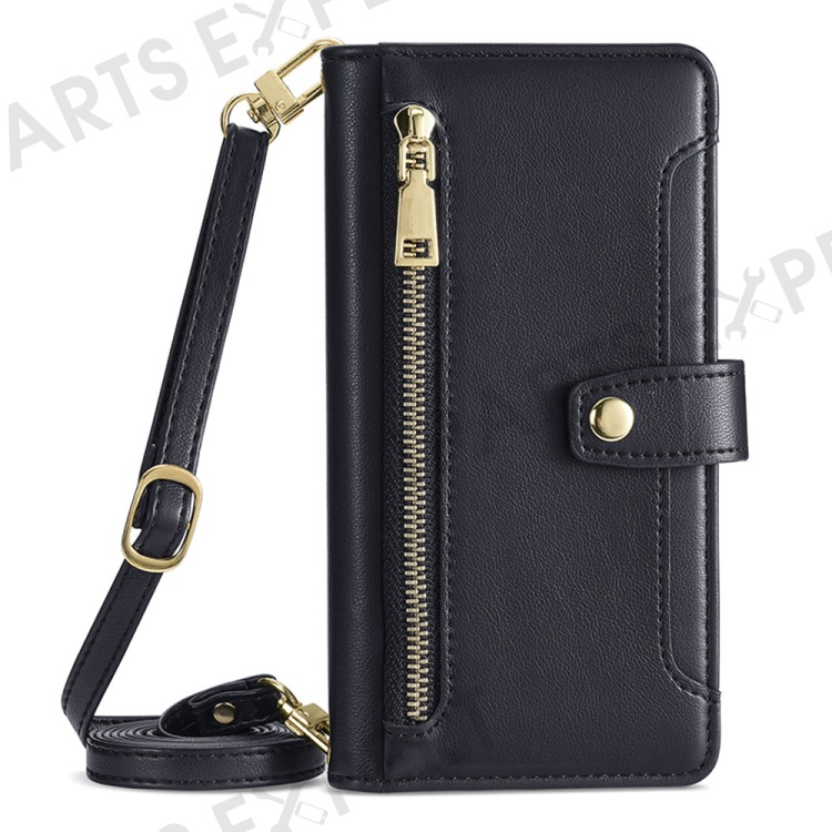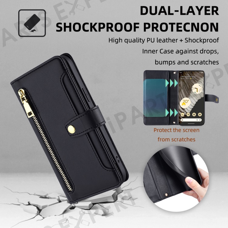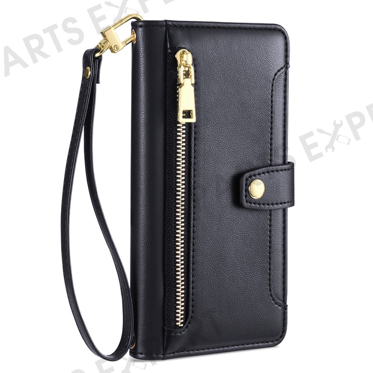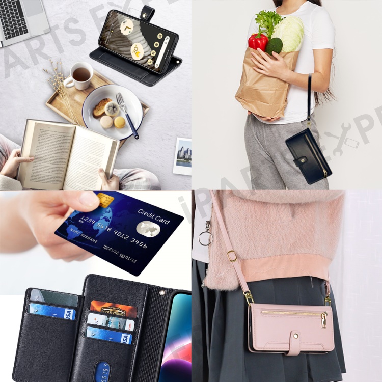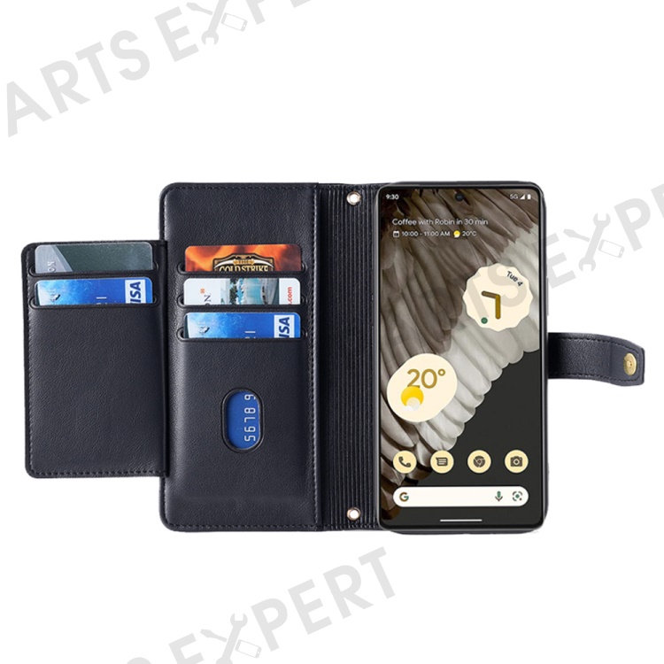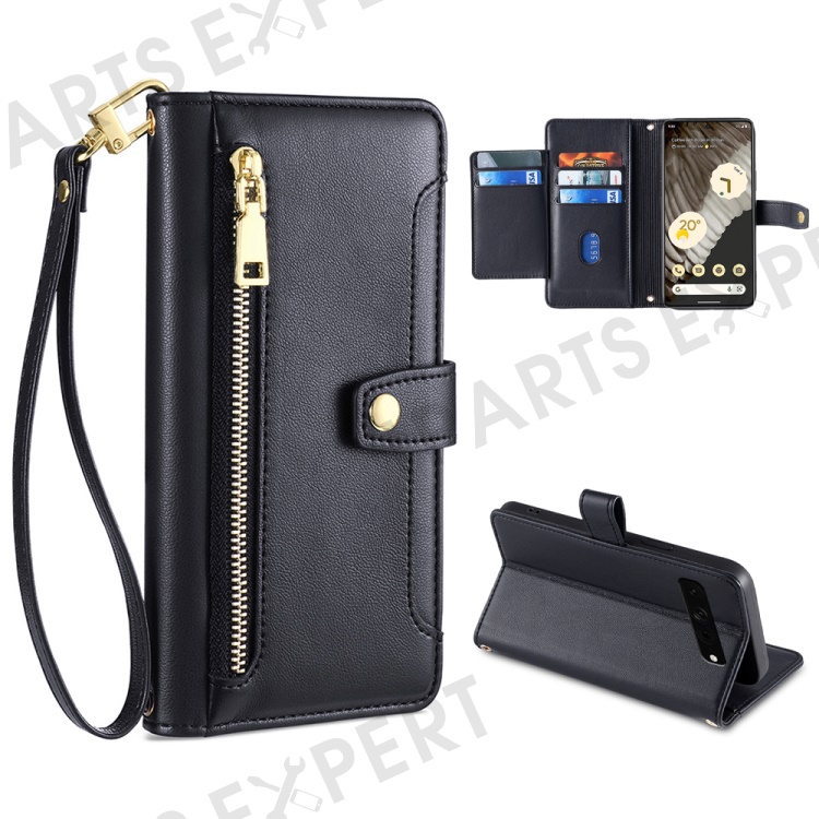 For Google Pixel 7 Pro 5G PU Leather Stand Case Zipper Pocket Phone Cover with Wrist Strap and Shoulder Strap - Black