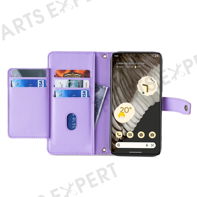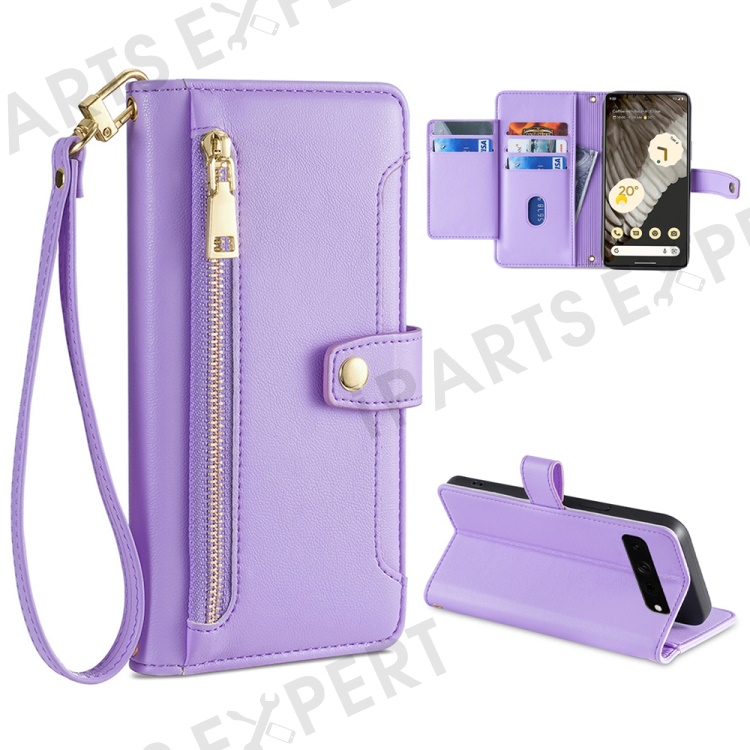 For Google Pixel 7 Pro 5G PU Leather Stand Case Zipper Pocket Phone Cover with Wrist Strap and Shoulder Strap - Purple
