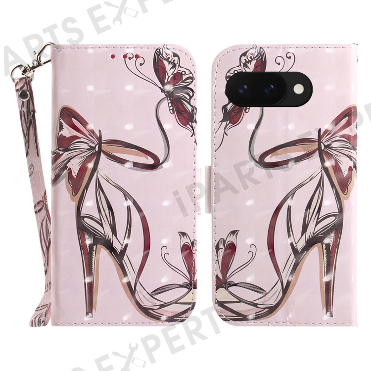 For Google Pixel 9a Case Pattern Printing Leather Wallet Phone Cover with Wrist Strap - Butterfly High Heels