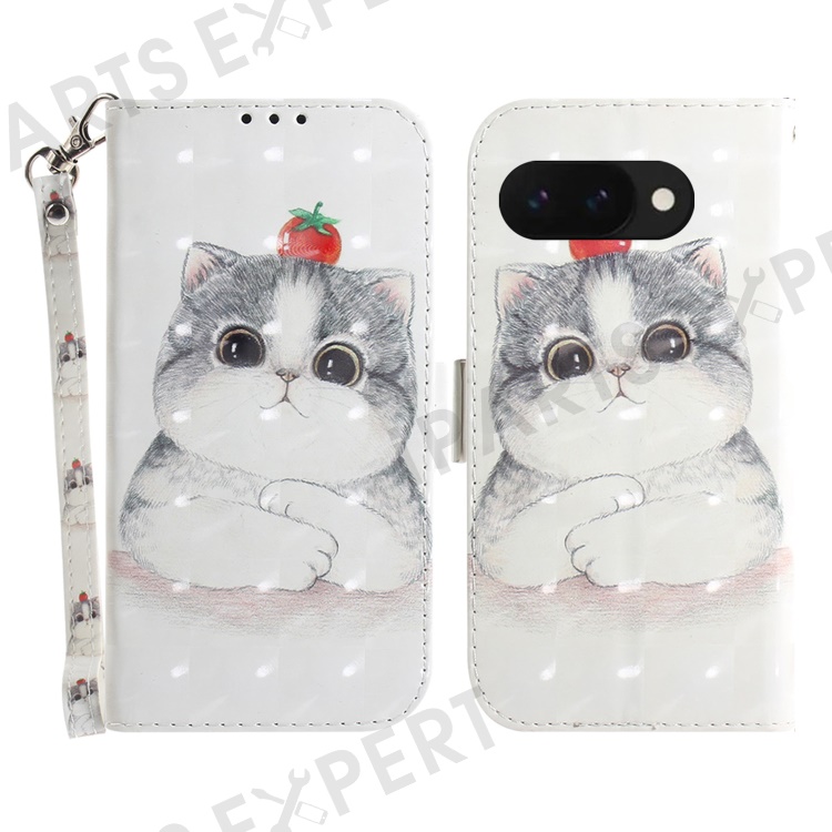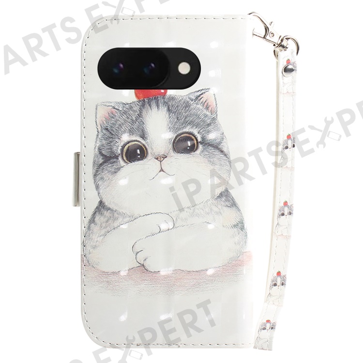 For Google Pixel 9a Case Pattern Printing Leather Wallet Phone Cover with Wrist Strap - Cute Cat