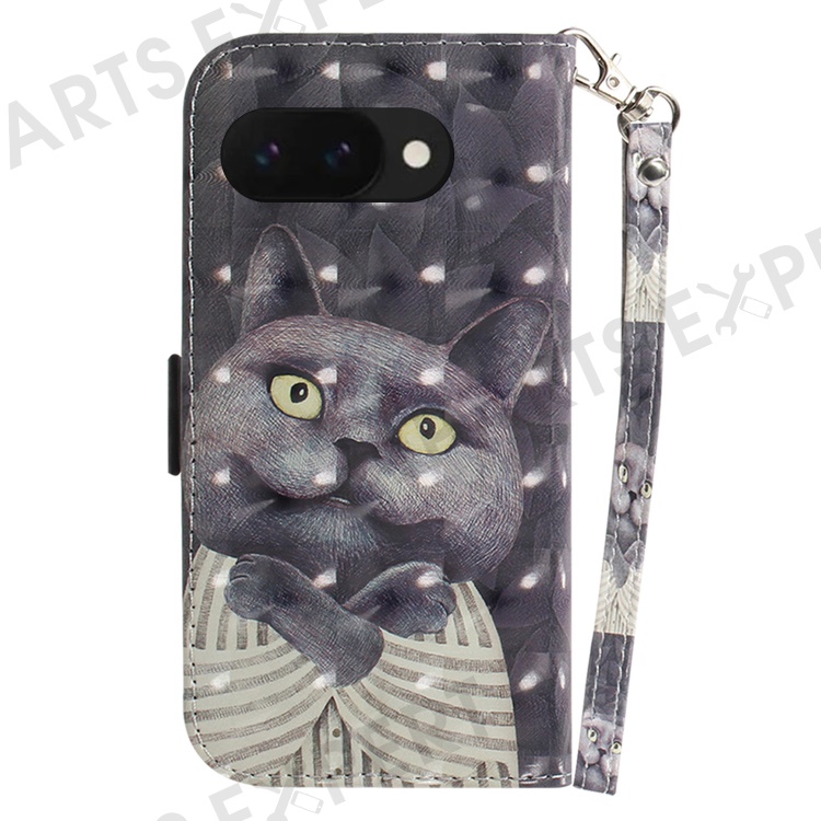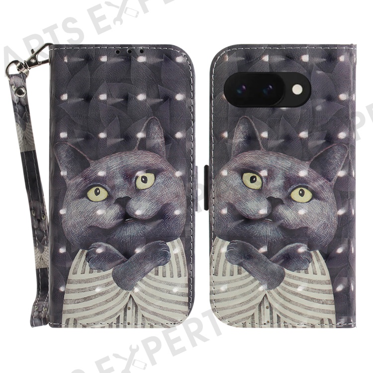 For Google Pixel 9a Case Pattern Printing Leather Wallet Phone Cover with Wrist Strap - Embracing Cat