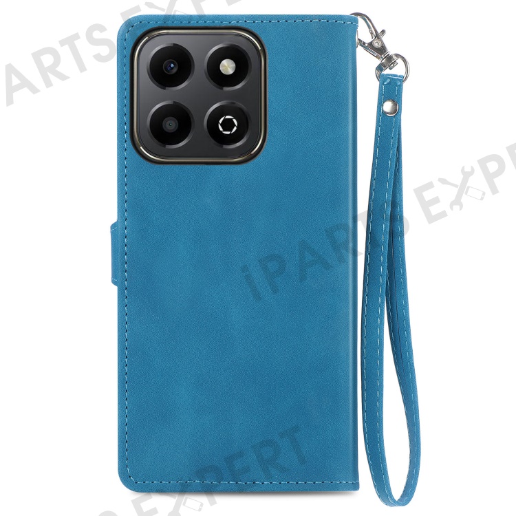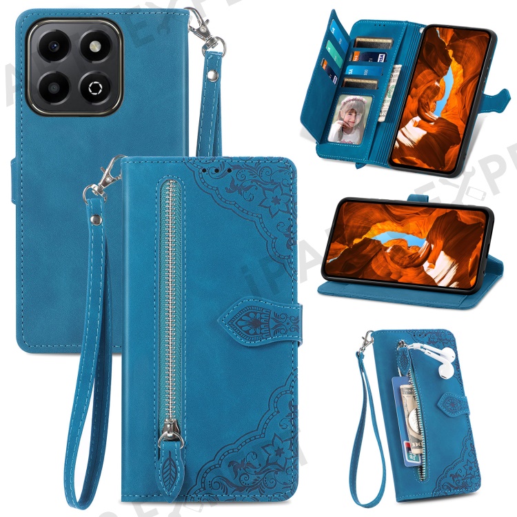 For Honor 200 Smart 5G / X7c 4G Zipper Wallet Case with Strap Flower Imprint PU Leather Phone Cover - Blue