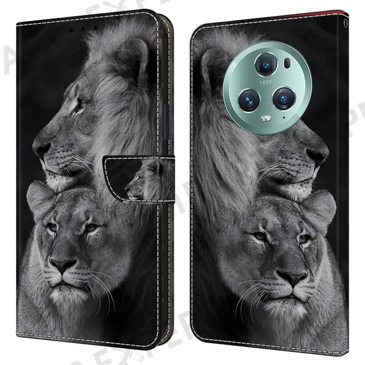 For Honor Magic5 Pro Leather Phone Case Wallet 3D Pattern All Inclusive Cover - Couple Lions