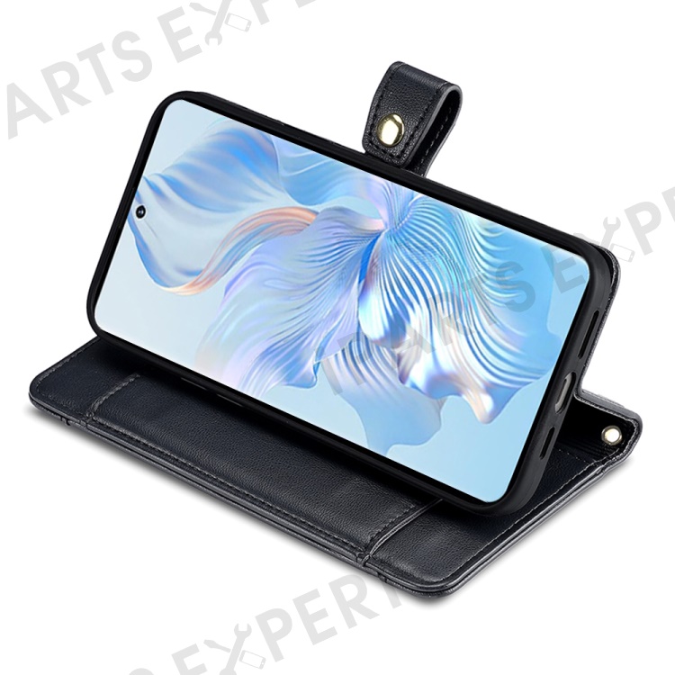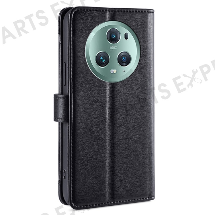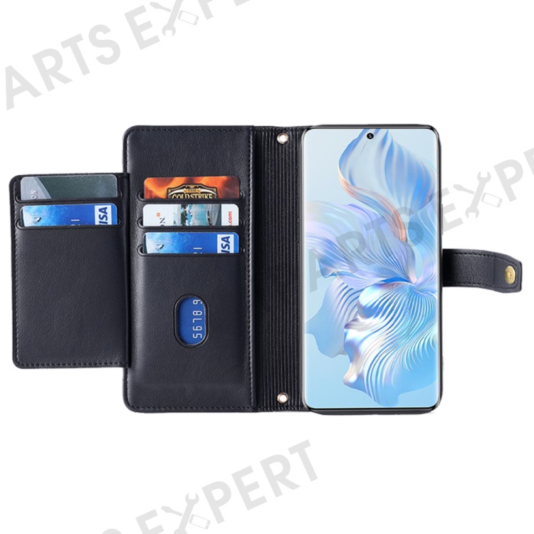 For Honor Magic5 Pro Phone Stand Leather Case Drop-Proof Zipper Pocket Wallet Cover with 2 Straps - Black