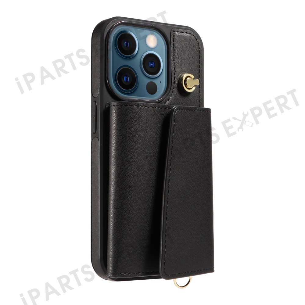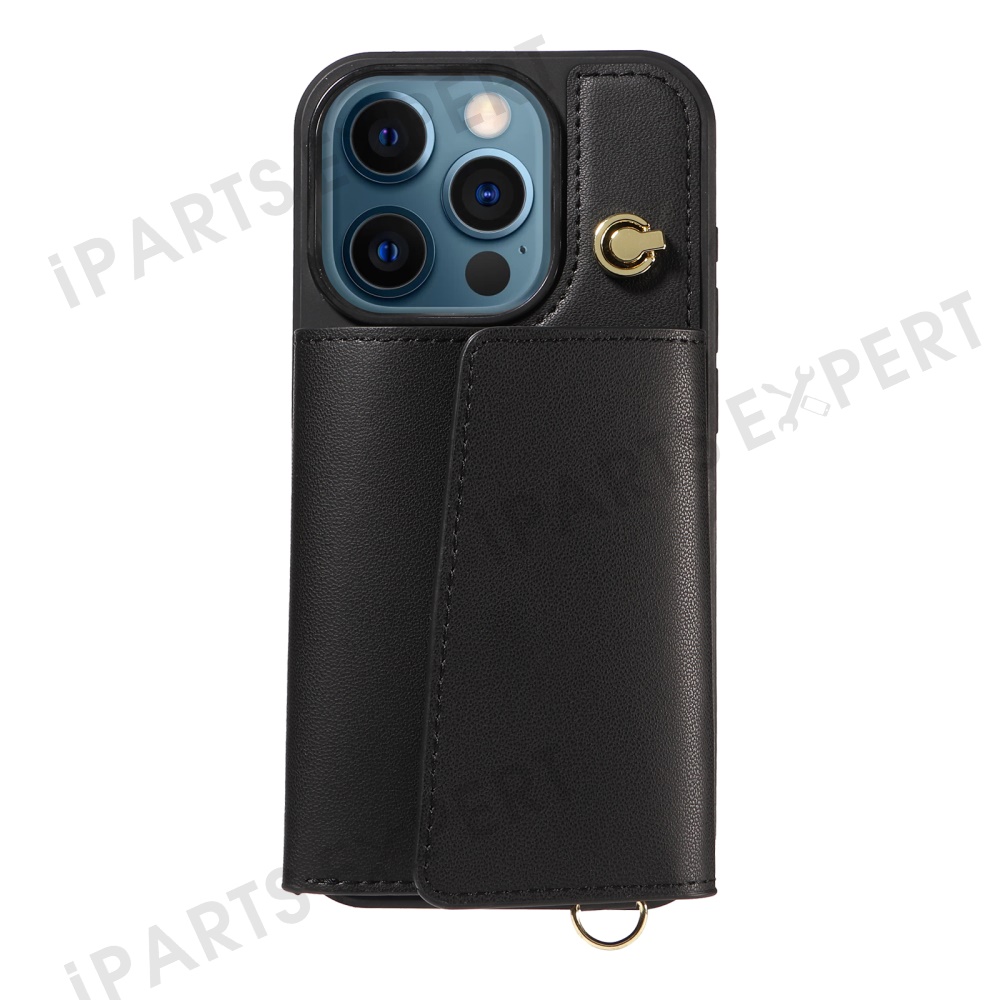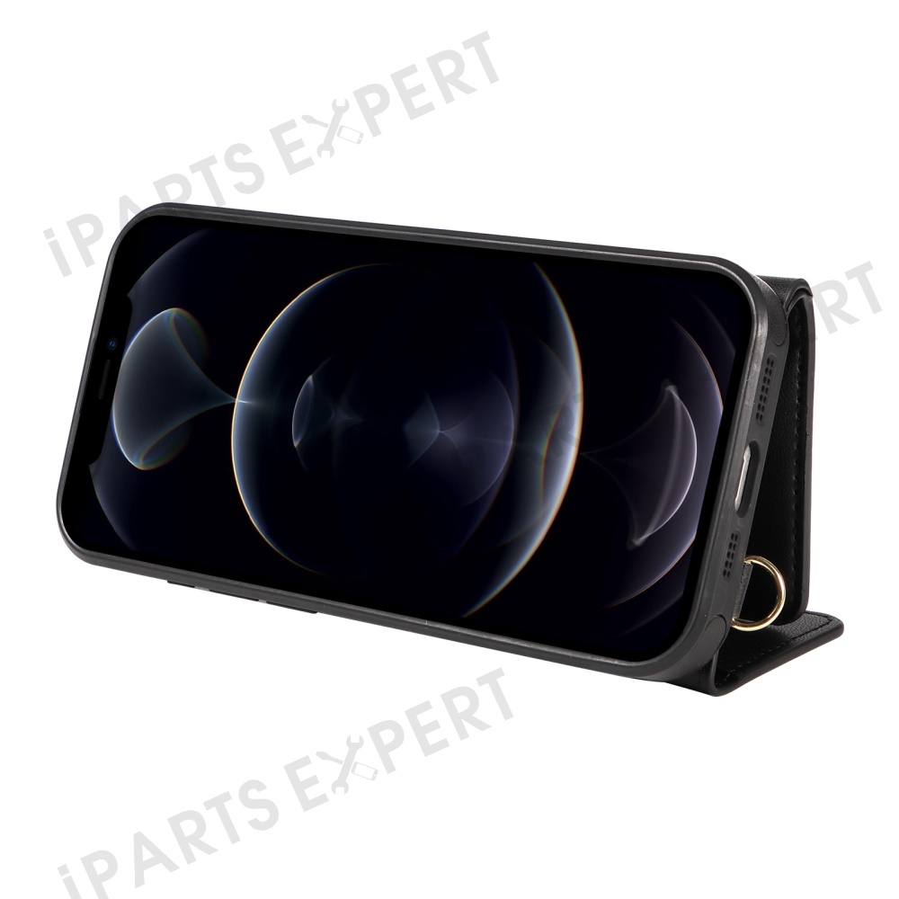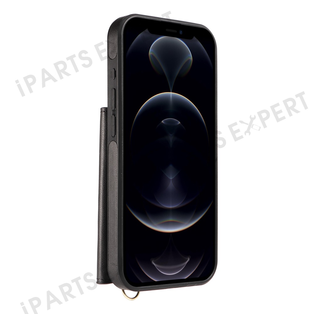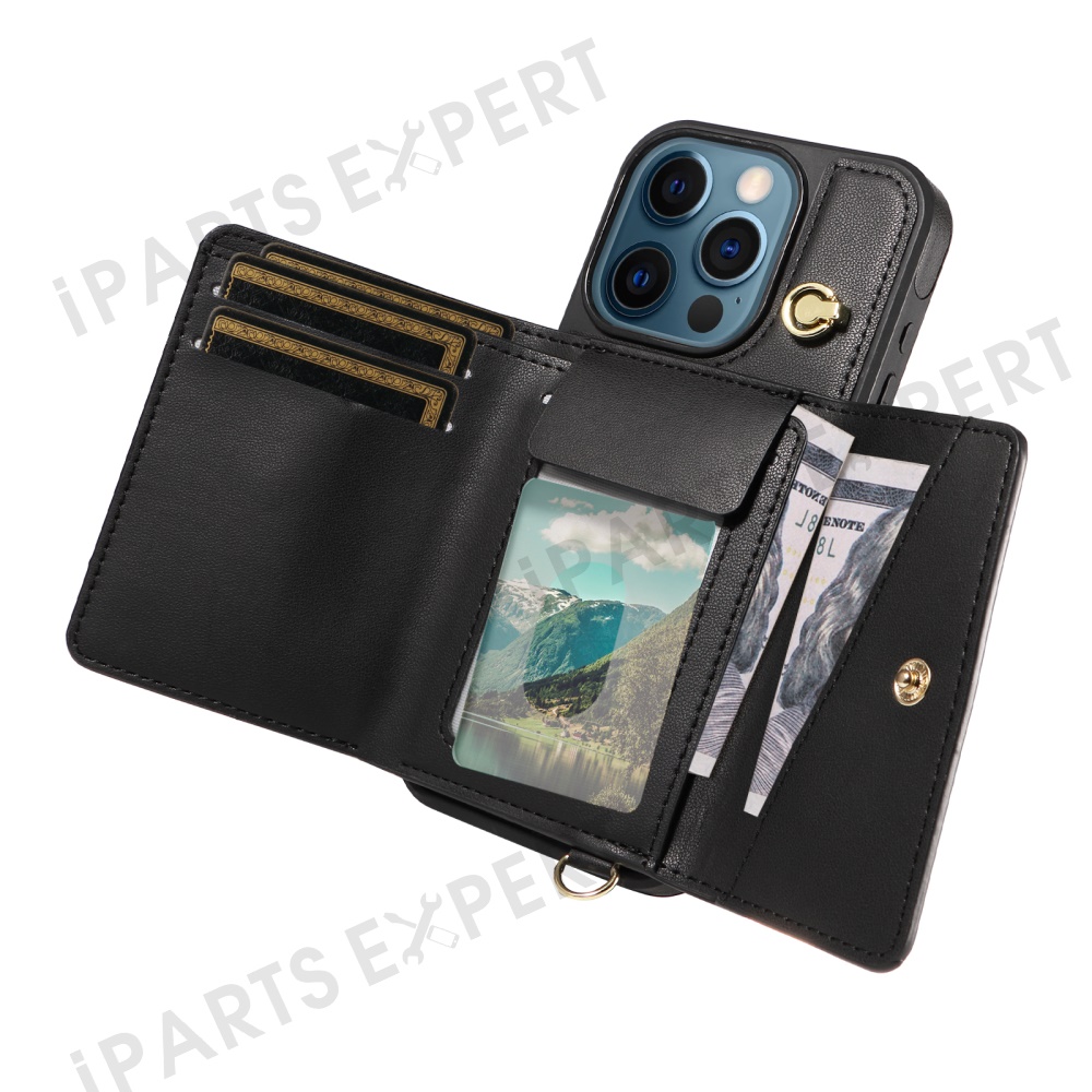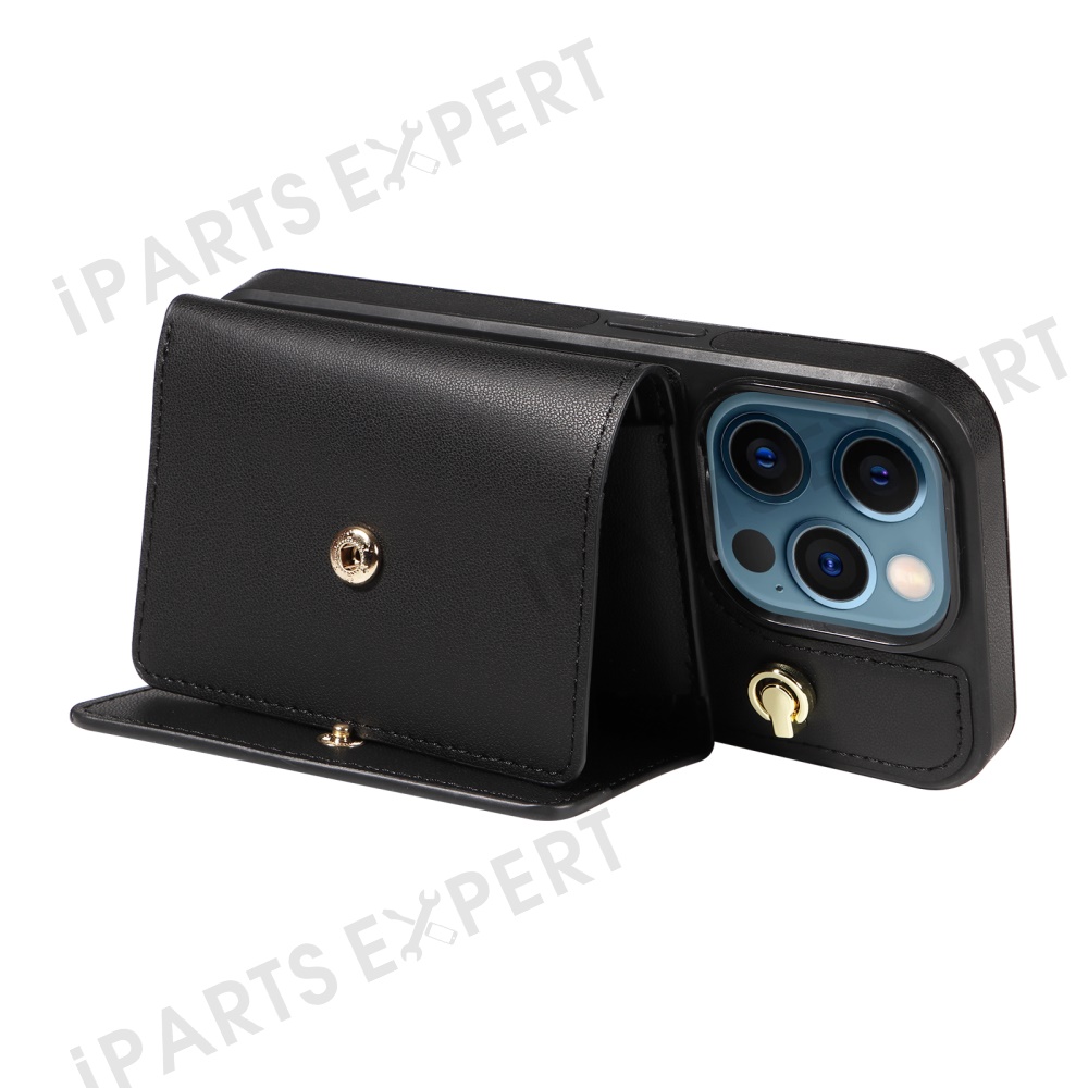 For iPhone 12 Pro Max Crossbody Phone Case Card Holder Kickstand Leather Coated TPU Mobile Cover - Black