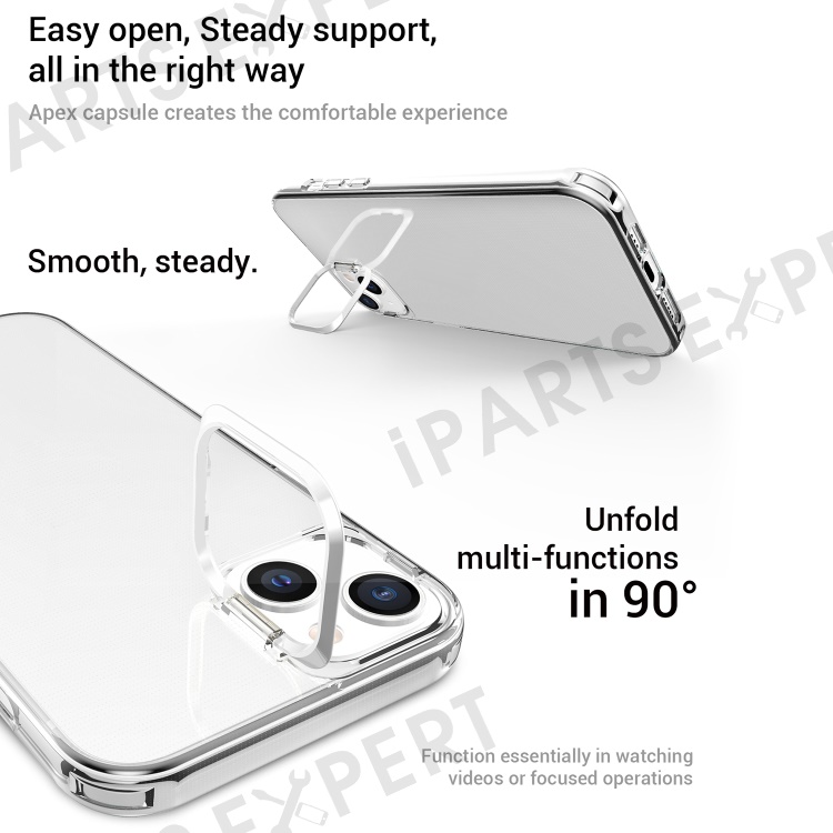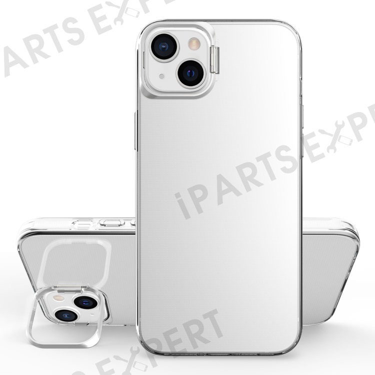For iPhone 13 6.1 inch / 14 Apex Capsule Series Anti-yellowing Phone Case Kickstand Clear 4 Corners Airbags Protective Soft TPU Phone Cover with Metal Camera Frame - Silver