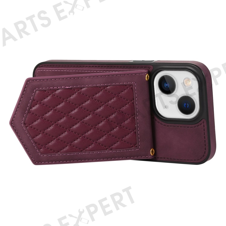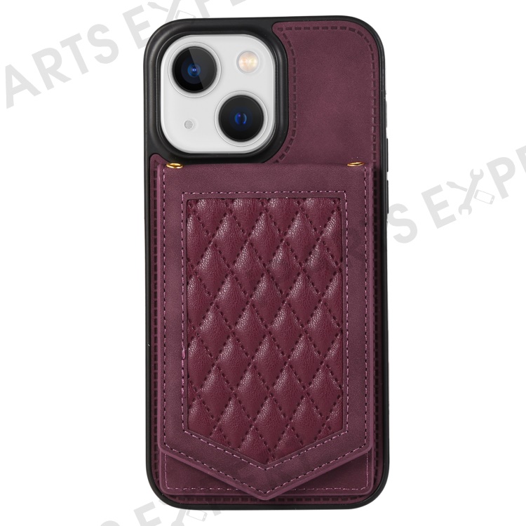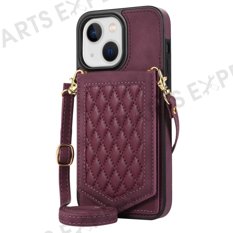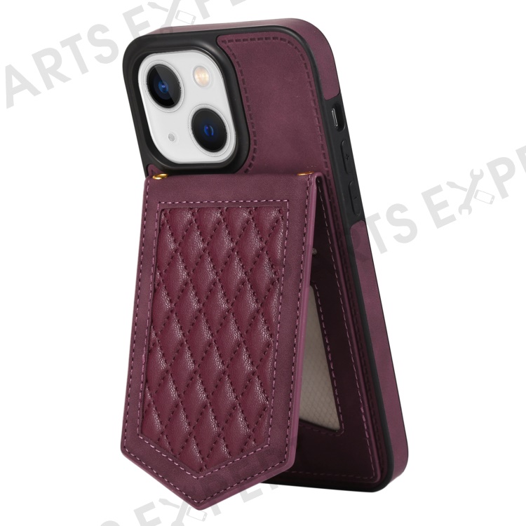 For iPhone 13 6.1 inch Imprinted Rhombus Makeup Mirror Kickstand Case PU Leather Coated TPU Card Slot RFID Blocking Phone Cover with Shoulder Strap - Wine Red