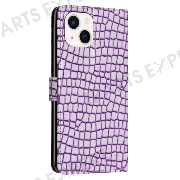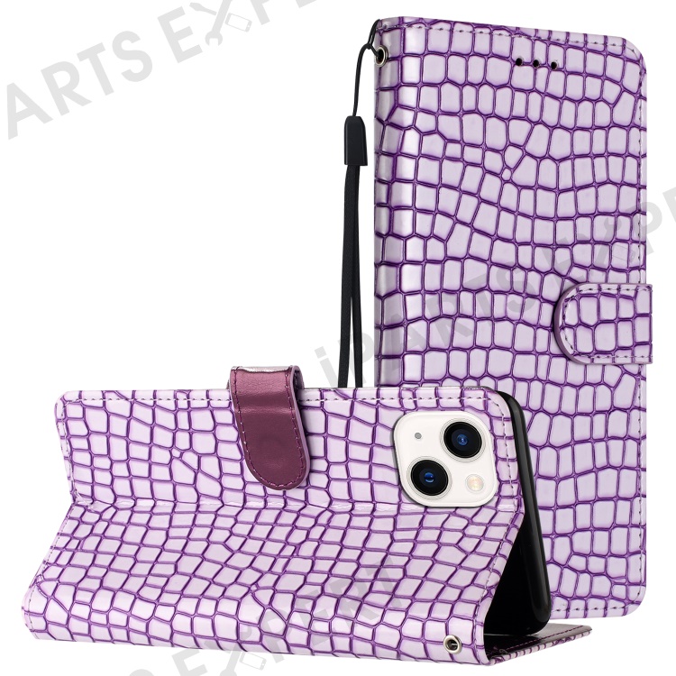 For iPhone 13 mini 5.4 inch Magnetic Clasp Crocodile Texture PU Leather Stand Phone Wallet Case with Hand Strap - Purple