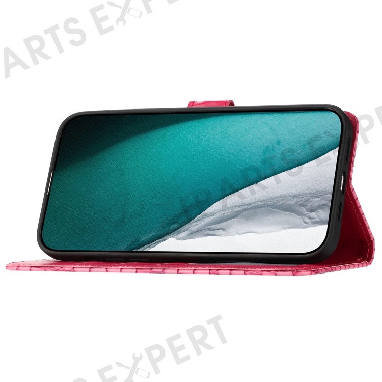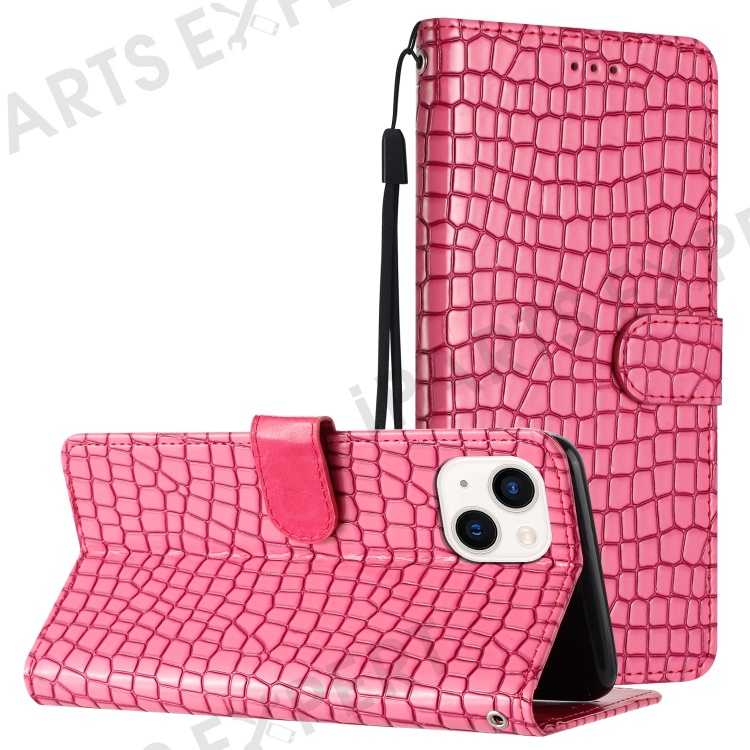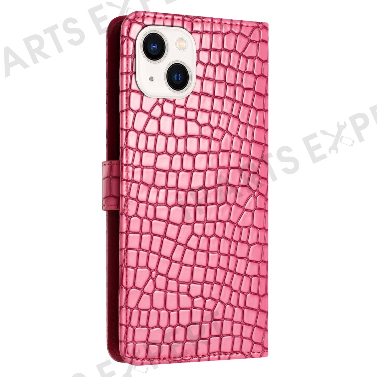 For iPhone 13 mini 5.4 inch Magnetic Clasp Crocodile Texture PU Leather Stand Phone Wallet Case with Hand Strap - Rose
