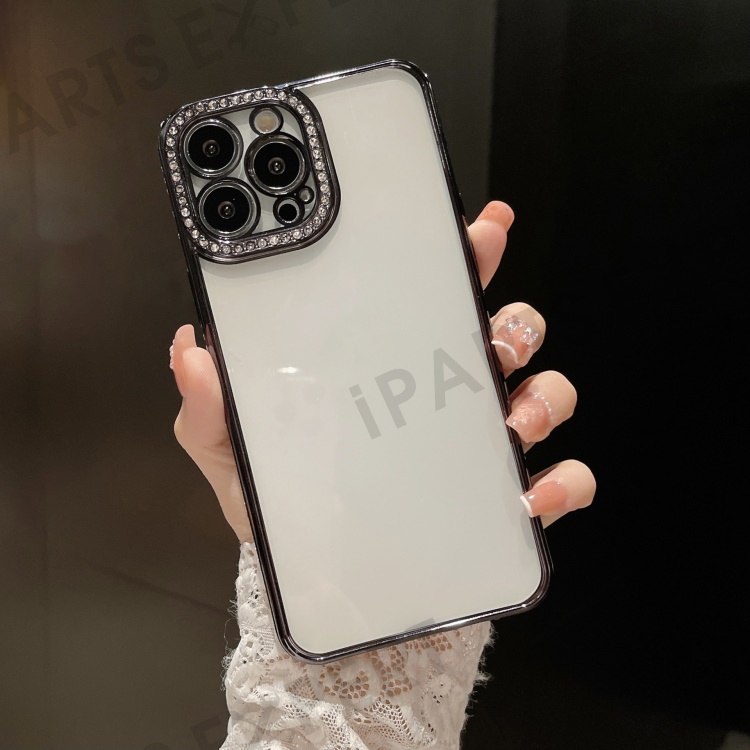 For iPhone 13 Pro 6.1 inch Rhinestone Decor Transparent Phone Case Electroplating Soft TPU Cover with Precise Cutout PET Lens Protector - Black