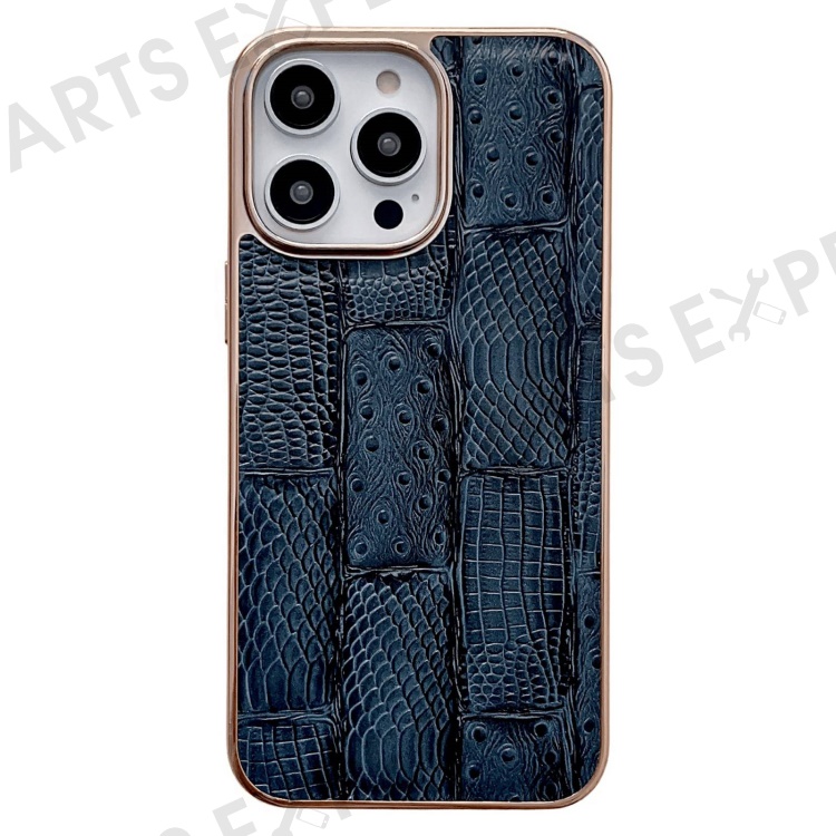 For iPhone 13 Pro 6.1 inch Slim Nano Electroplating Mahjong Texture Cell Phone Back Cover Genuine Cowhide Leather+PC+TPU Phone Shell - Blue