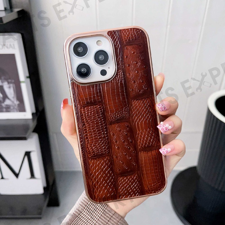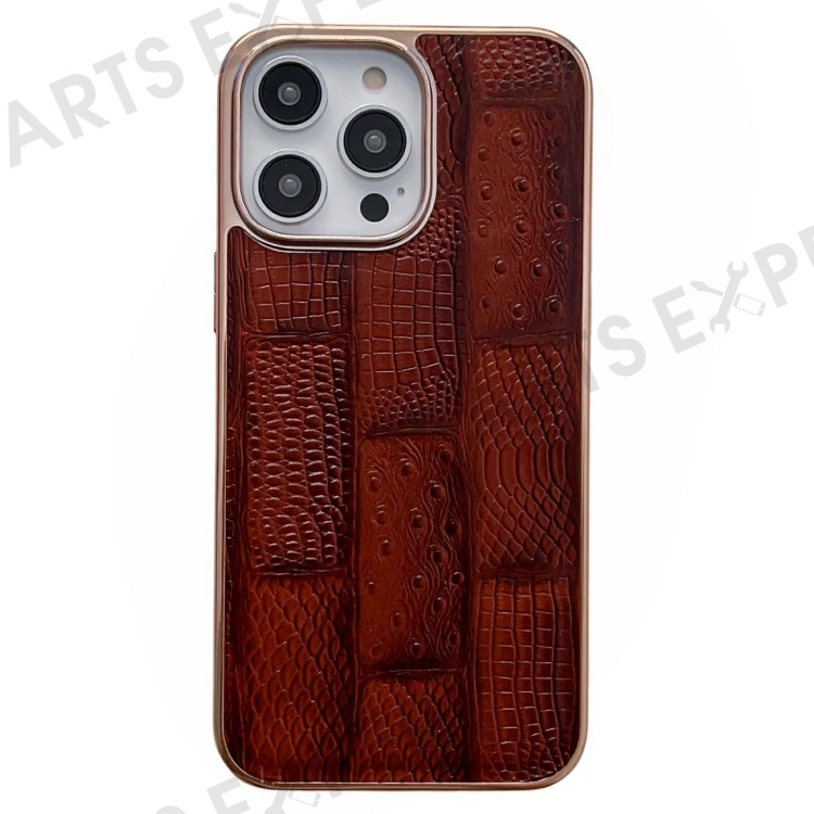 For iPhone 13 Pro 6.1 inch Slim Nano Electroplating Mahjong Texture Cell Phone Back Cover Genuine Cowhide Leather+PC+TPU Phone Shell - Brown
