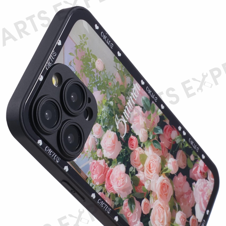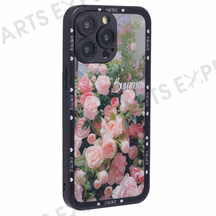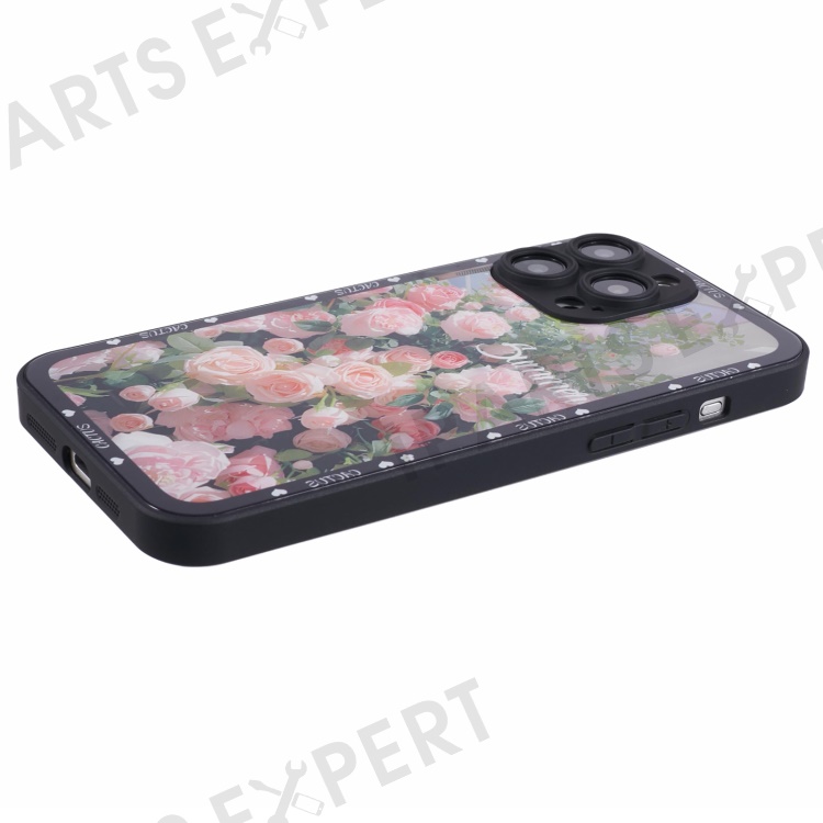 KYW Series for iPhone 13 Pro Case Camera Protection Flower Pattern Tempered Glass Phone Cover - Black / Pink Roses
