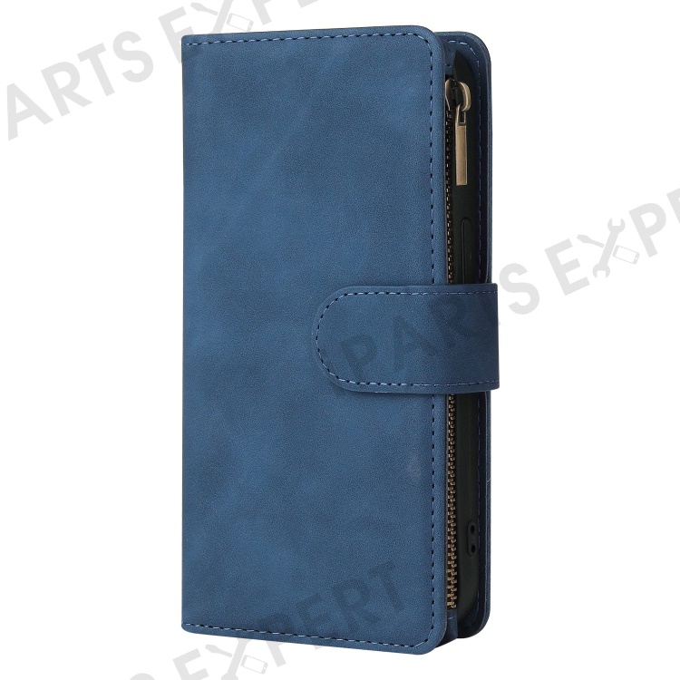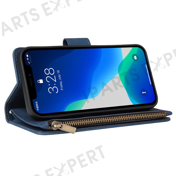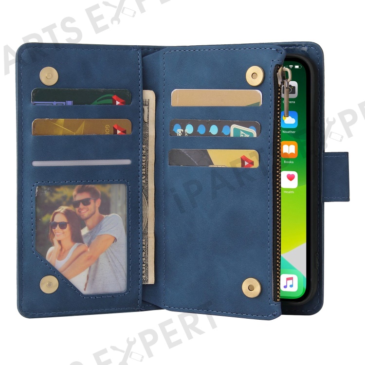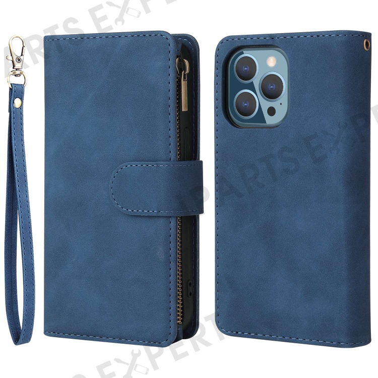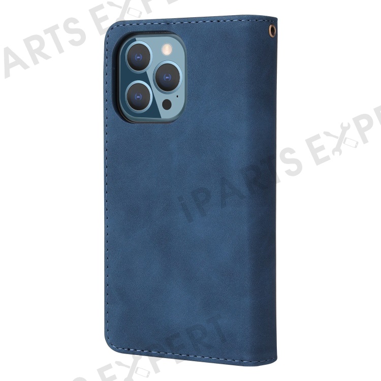 For iPhone 13 Pro Max 6.7 inch PU Leather Multi Card Slots Phone Wallet Stand Cover Zipper Pocket Design Anti-drop Case - Blue