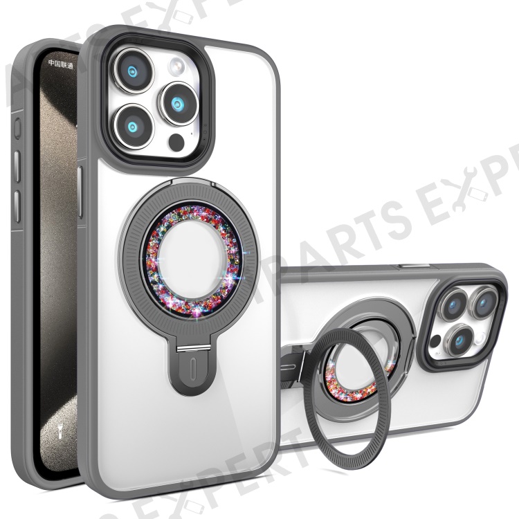 For iPhone 13 Pro Max Magnetic Case PC+TPU Phone Cover with Rhinestone Ring Kickstand - Grey
