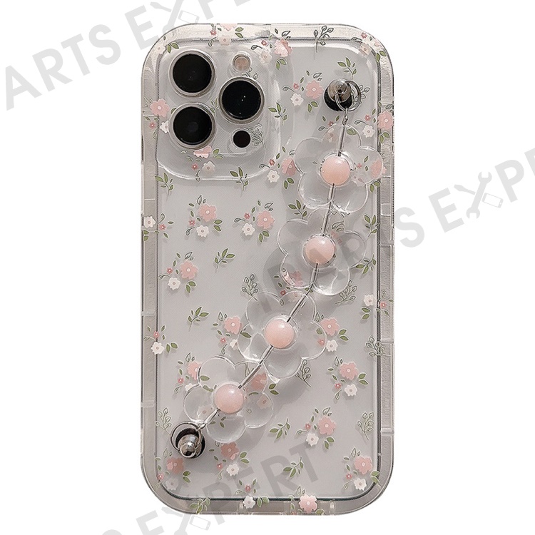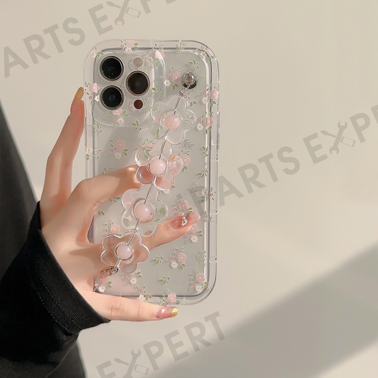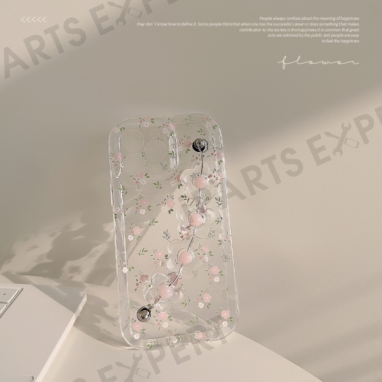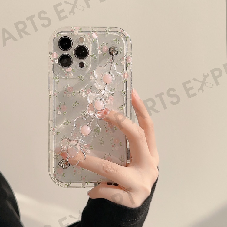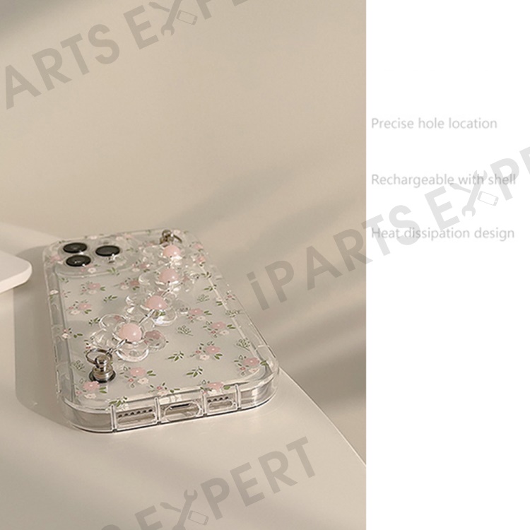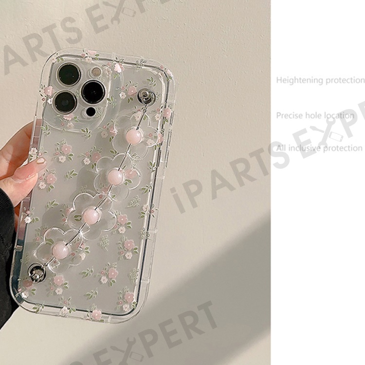 For iPhone 13 Pro Max Transparent Phone Case Flower Pattern TPU Cover with Flower Decor Chain