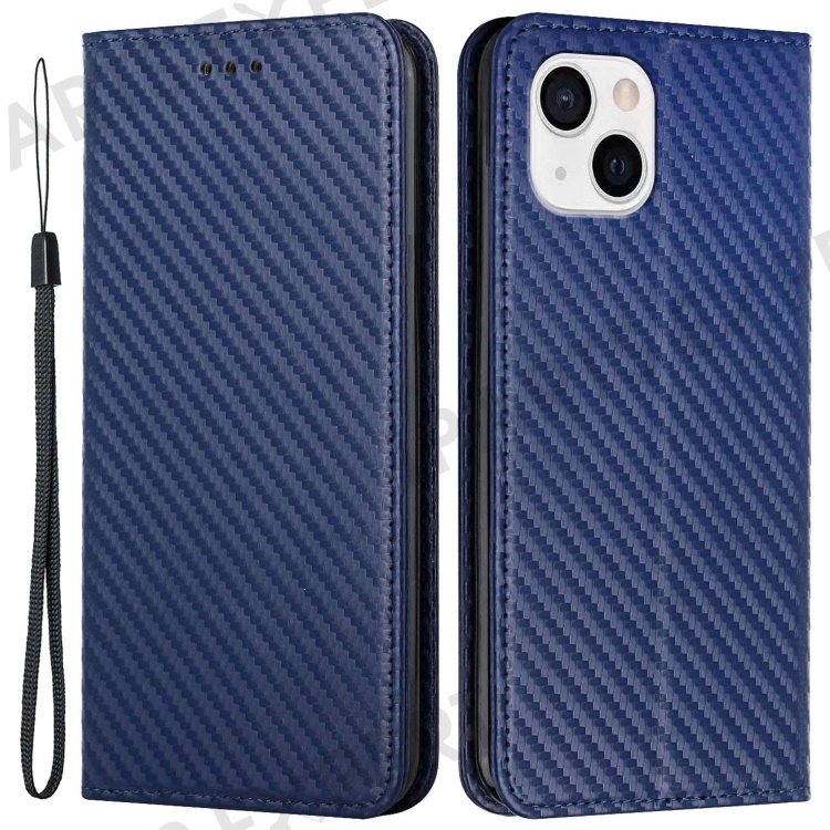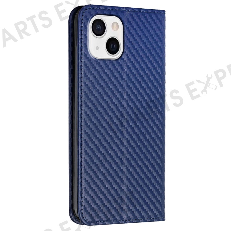 For iPhone 14 6.1 inch Carbon Fiber Texture PU Leather Case Auto Magnetic Closed Flip Stand Wallet Cover - Blue