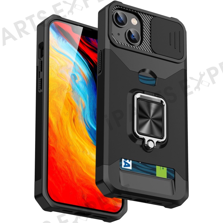 For iPhone 14 6.1 inch Hard PC Soft TPU Hybrid Cell Phone Case Wear-Resistant Slide Camera Lens Cover Design Kickstand Back Cover with Card Slot - Black