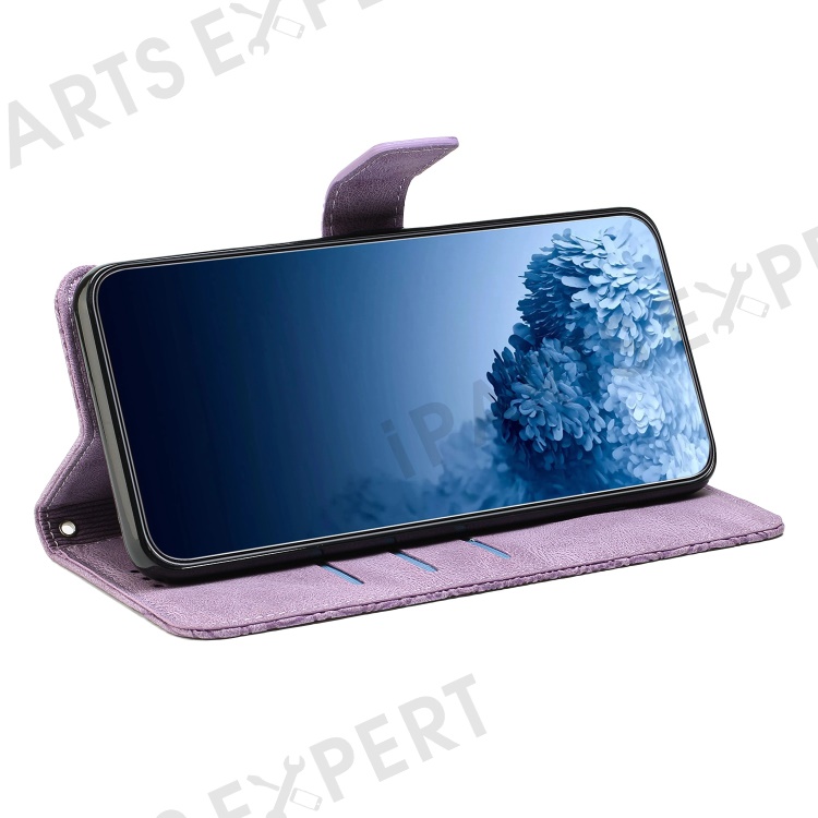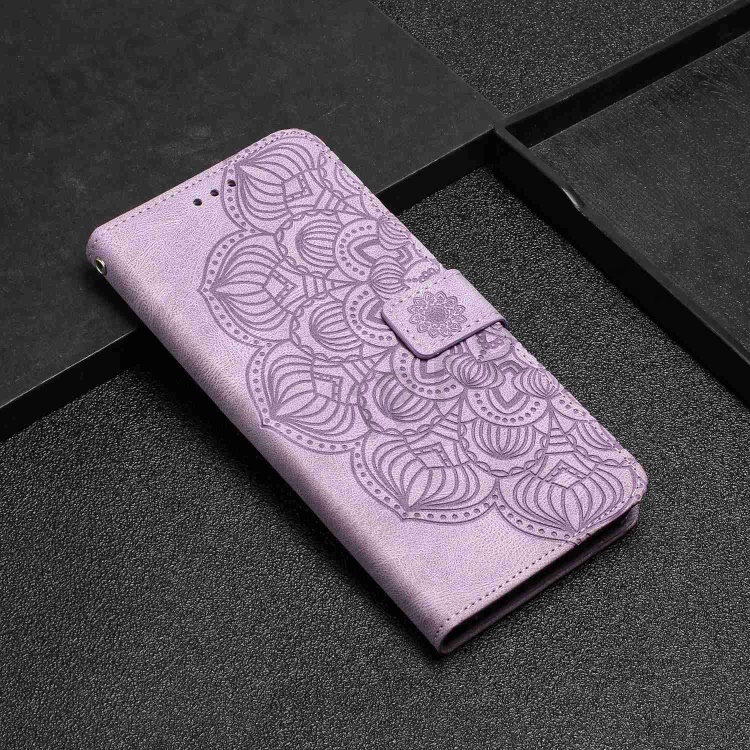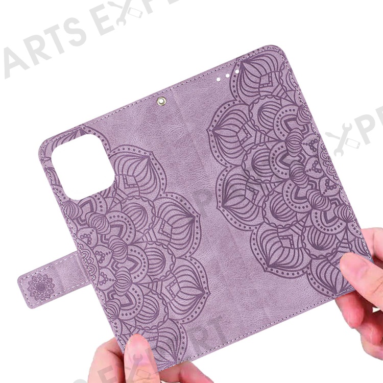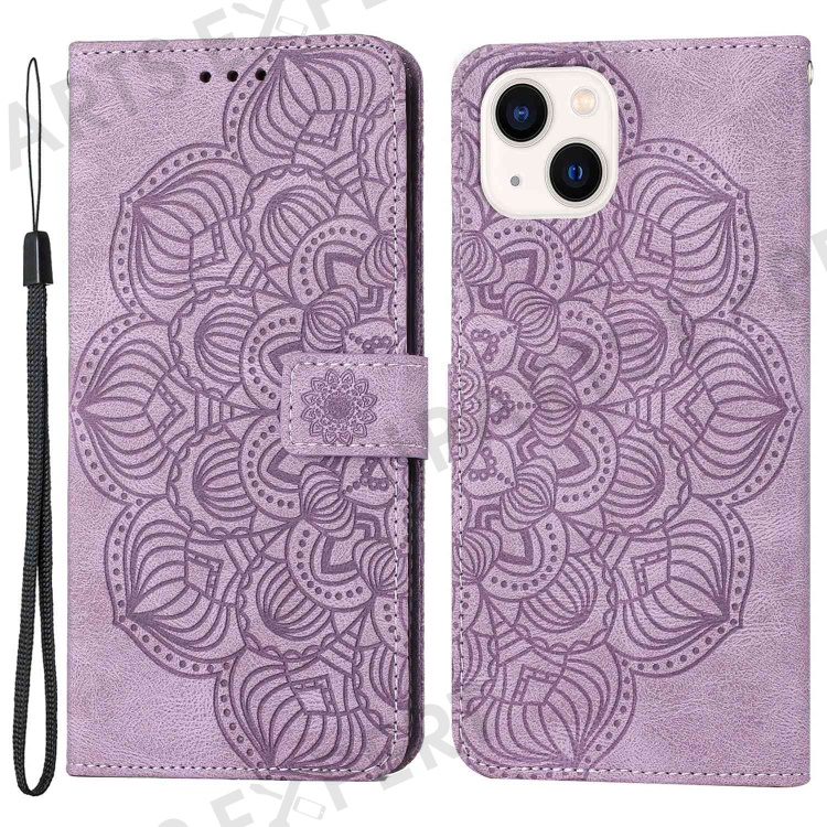 For iPhone 14 6.1 inch Mandala Flower Imprinted PU Leather Magnetic Flip Cover Stand Feature Hand Strap Wallet Purse Case - Purple