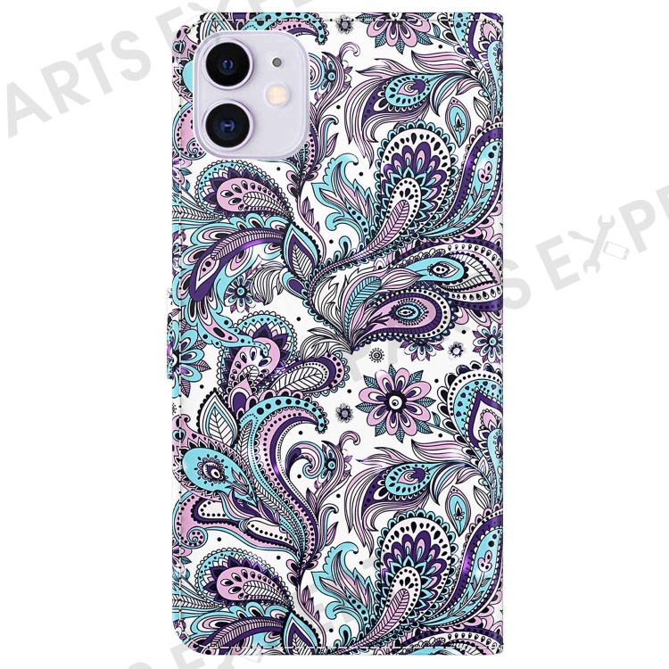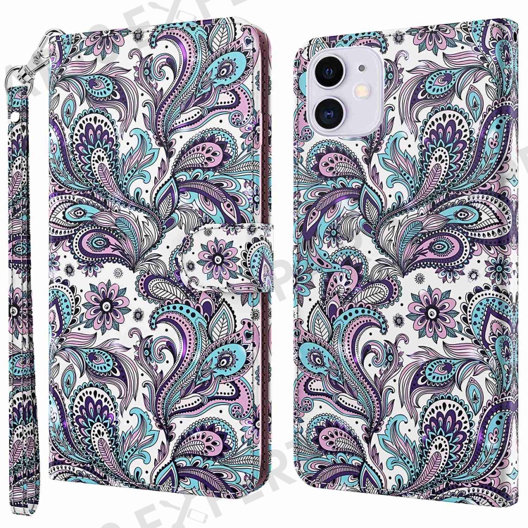 For iPhone 14 6.1 inch Shockproof PU Leather Phone Case Stand 3D Pattern Printed Magnet Closure Wallet Full Protection Phone Cover with Strap - Purple Impatiens
