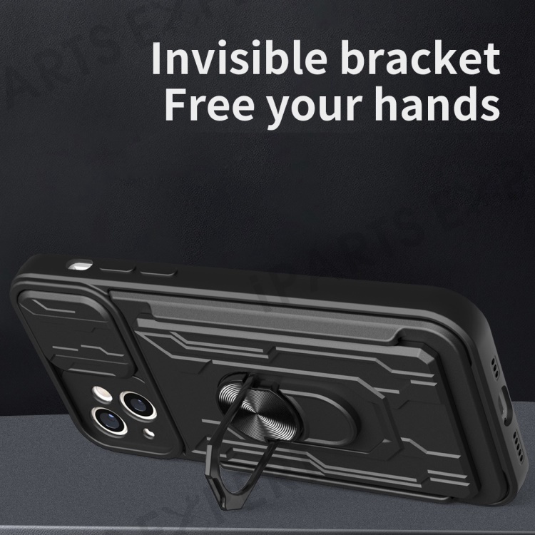For iPhone 14 6.1 inch Slide Lens Protection Design Kickstand Case Hard PC Soft TPU Impact-Resistant Cover with Card Holder - Blackish Green