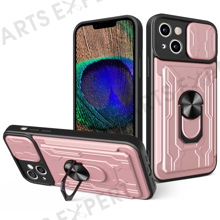 For iPhone 14 6.1 inch Slide Lens Protection Design Kickstand Case Hard PC Soft TPU Impact-Resistant Cover with Card Holder - Rose Gold