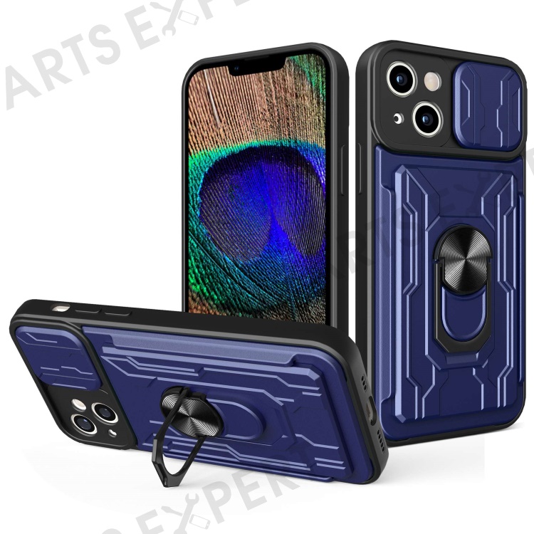 For iPhone 14 6.1 inch Slide Lens Protection Design Kickstand Case Hard PC Soft TPU Impact-Resistant Cover with Card Holder - Sapphire