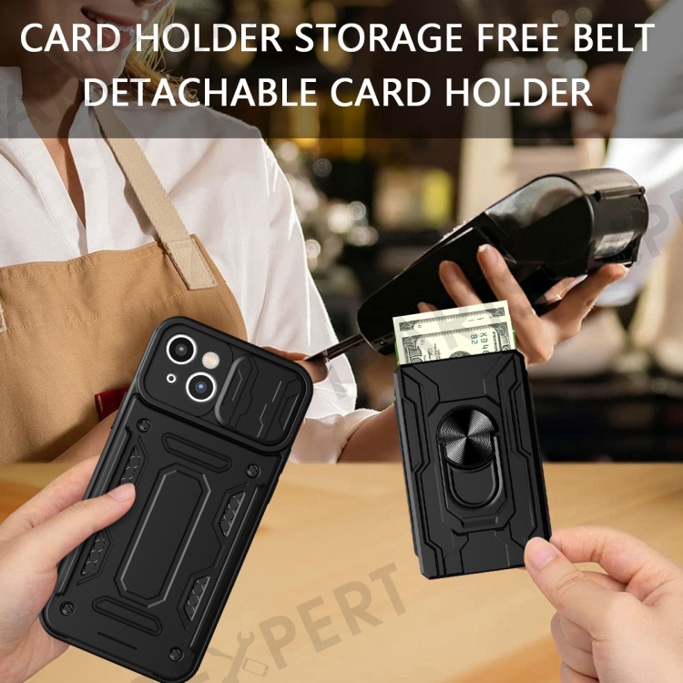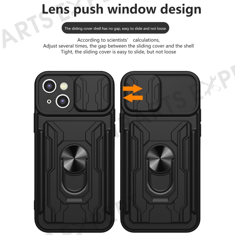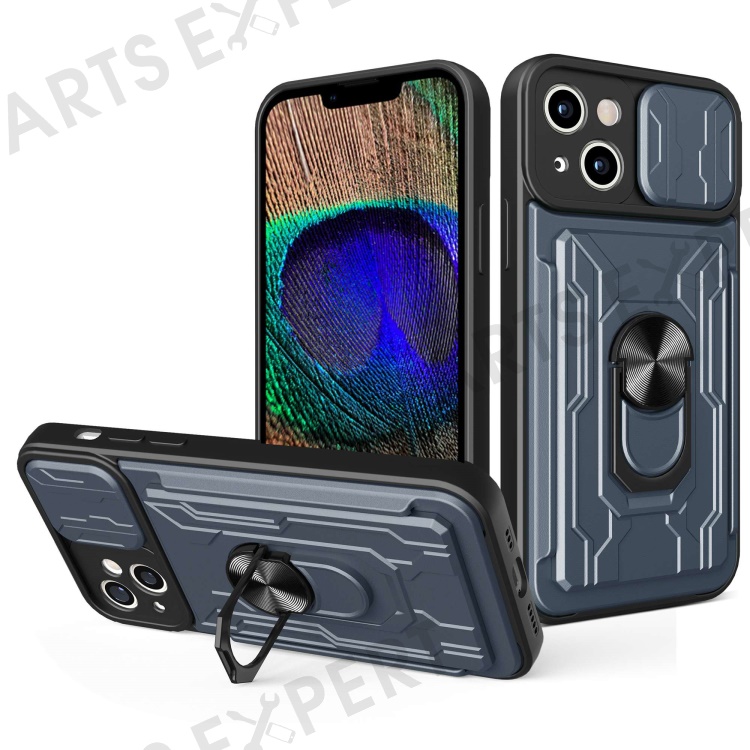 For iPhone 14 6.1 inch Slide Lens Protection Design Kickstand Case Hard PC Soft TPU Impact-Resistant Cover with Card Holder - Titanium Grey
