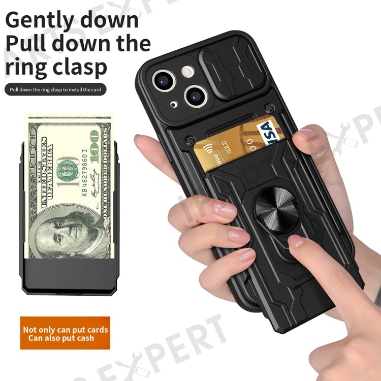 For iPhone 14 6.1 inch Slide Lens Protection Design Kickstand Case Hard PC Soft TPU Impact-Resistant Cover with Card Holder - White