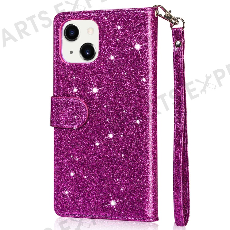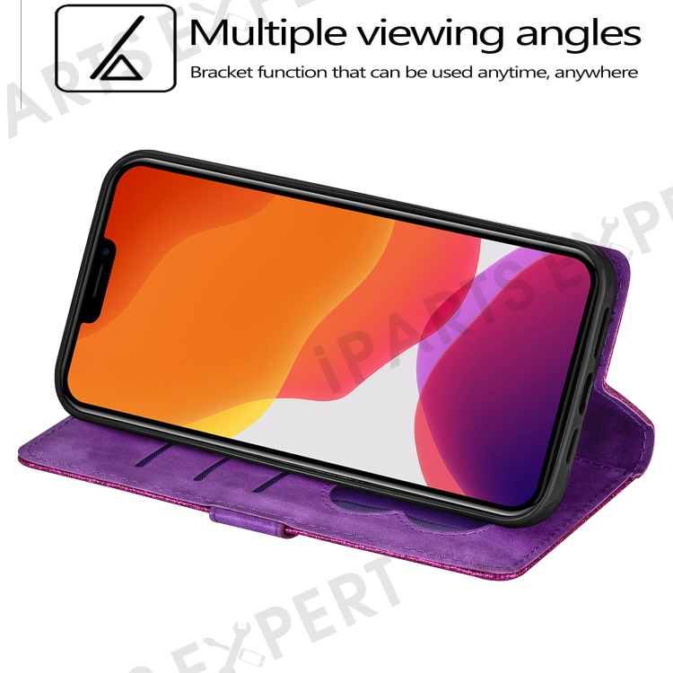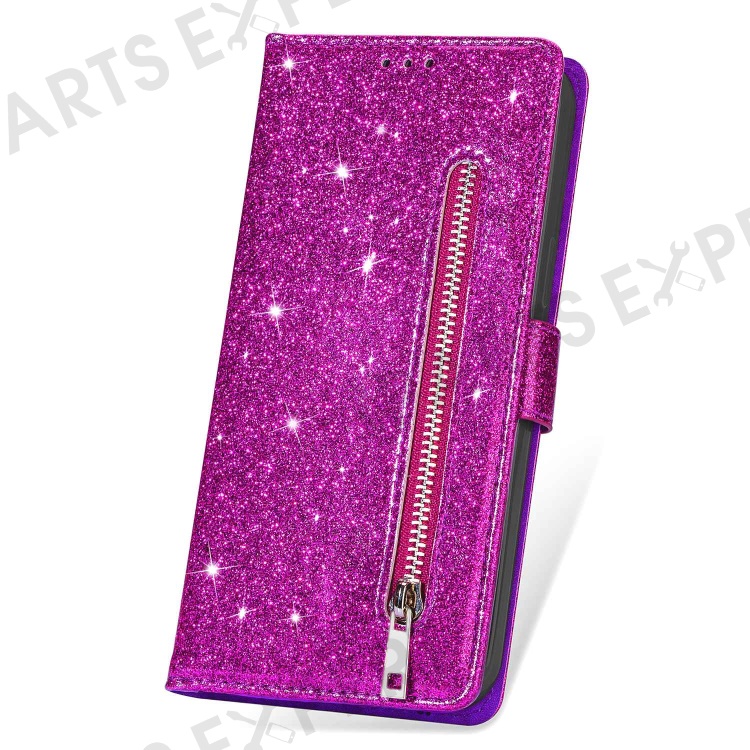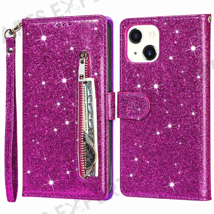 For iPhone 14 6.1 inch Zipper Pocket Glittery PU Leather Case Wallet Stand Magnetic Clasp Anti-fall Phone Cover - Purple