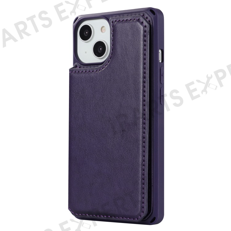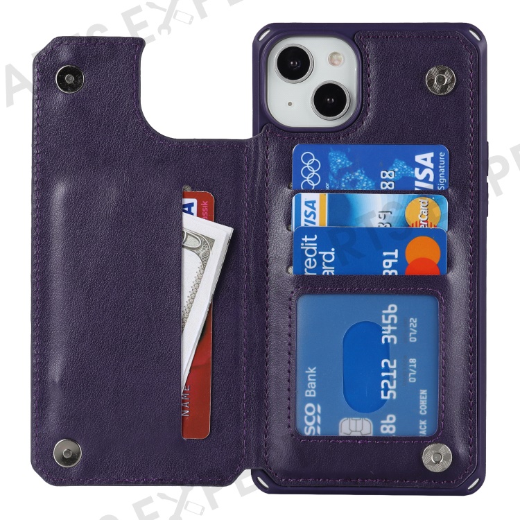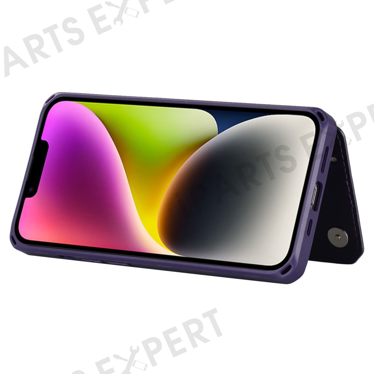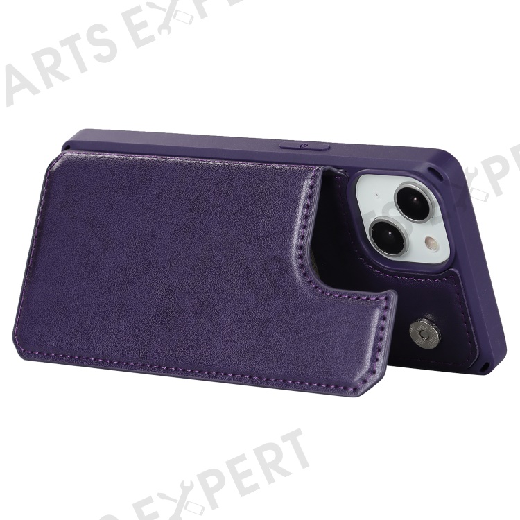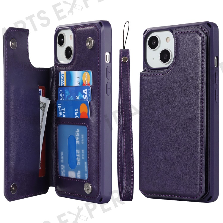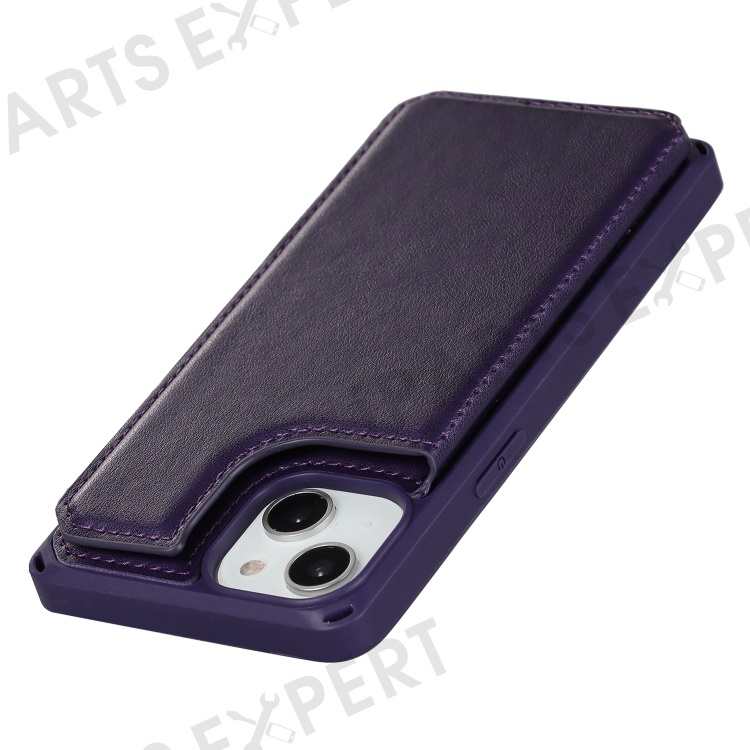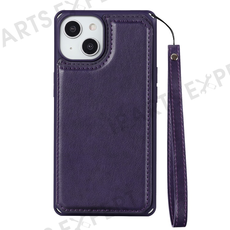 For iPhone 14 Plus Card Slots Design Kickstand PU Leather Coated TPU Phone Case Anti-collision Wallet Cover with Strap - Dark Purple