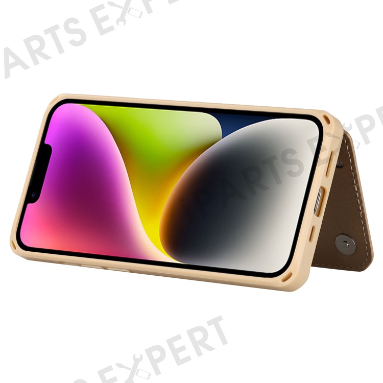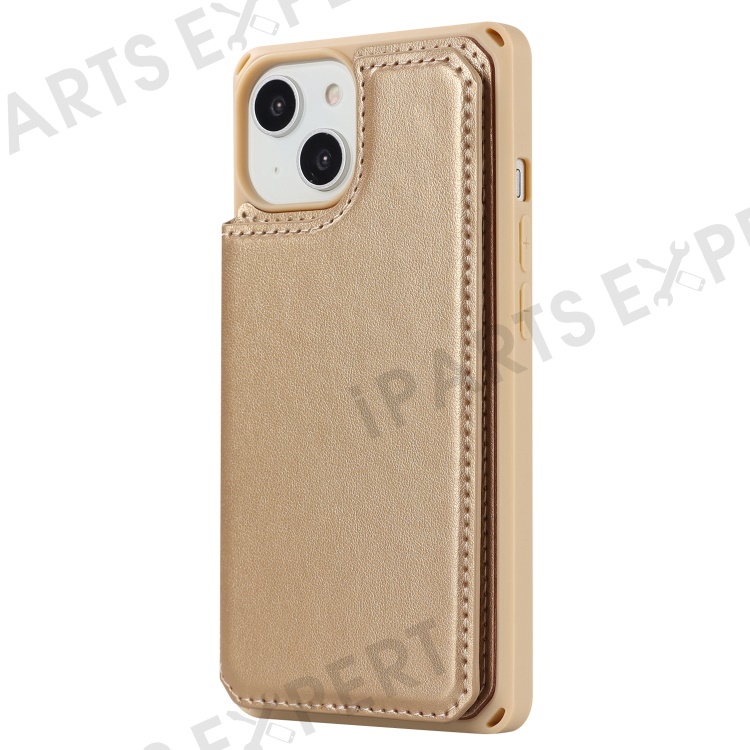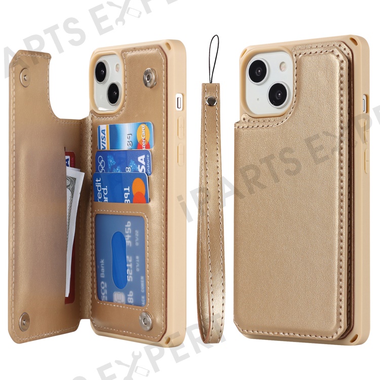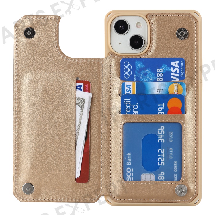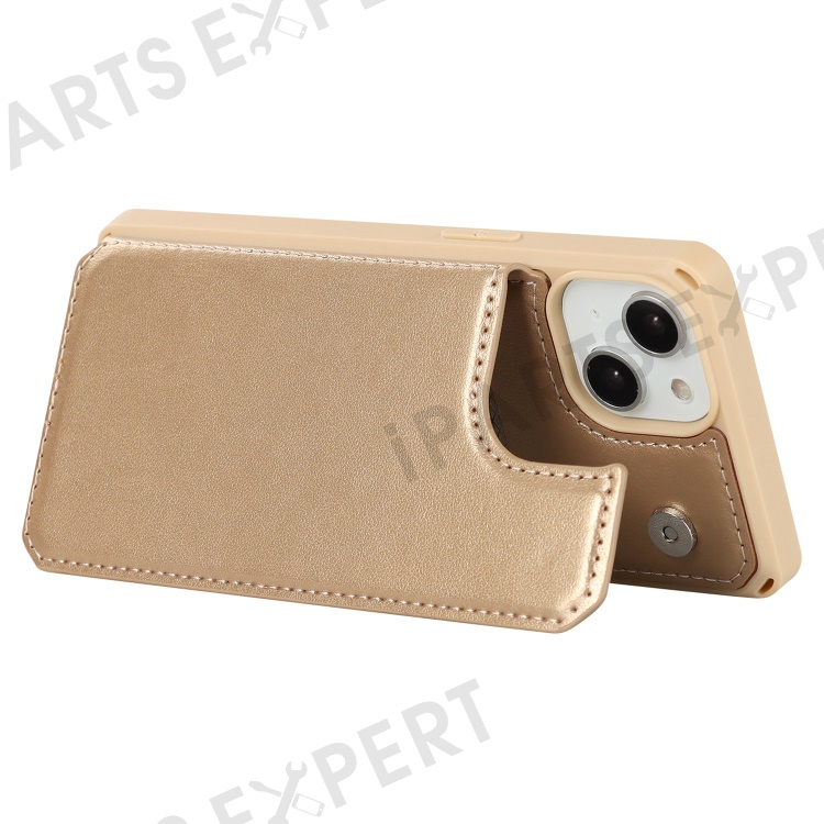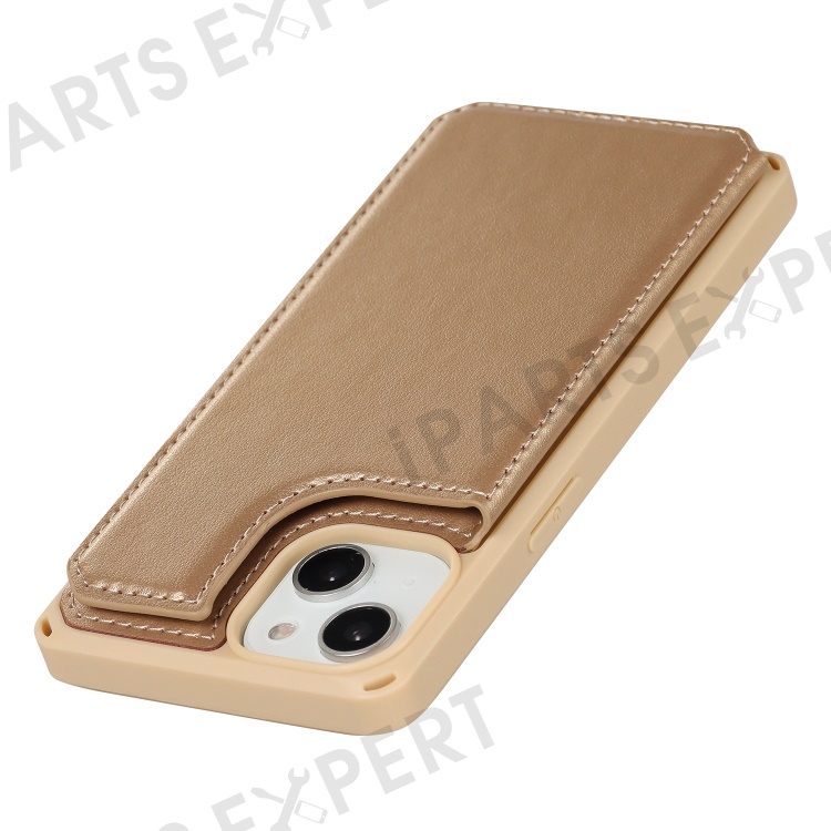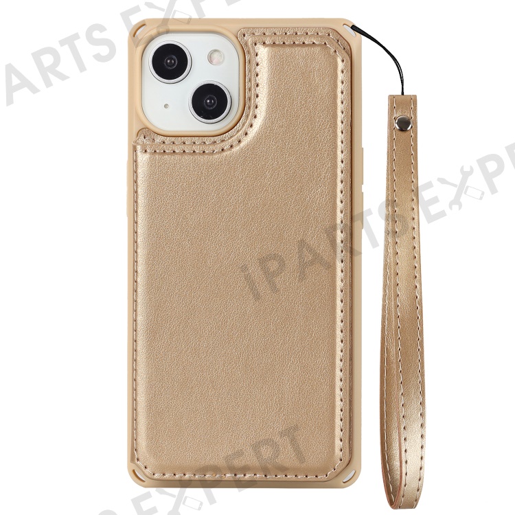 For iPhone 14 Plus Card Slots Design Kickstand PU Leather Coated TPU Phone Case Anti-collision Wallet Cover with Strap - Gold