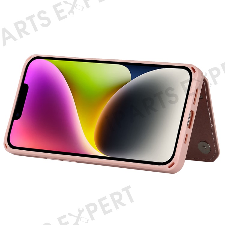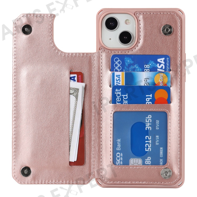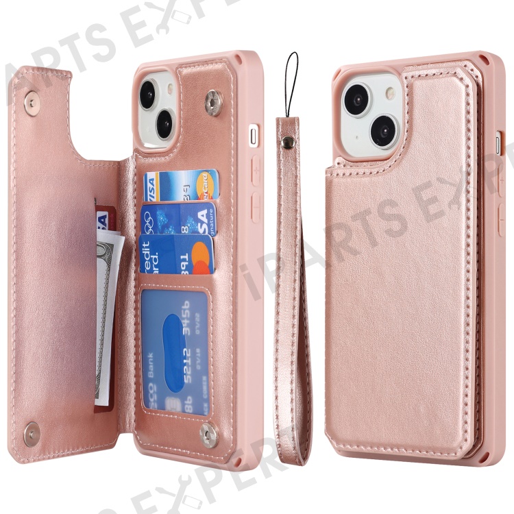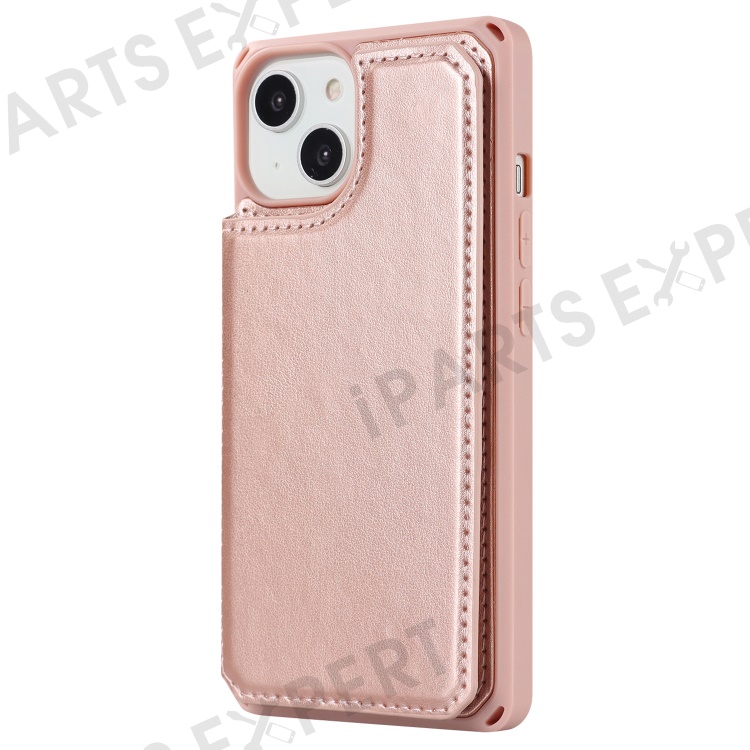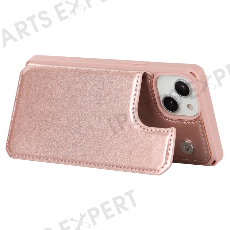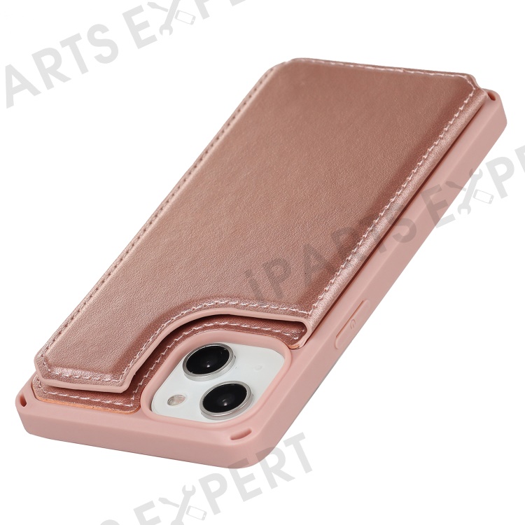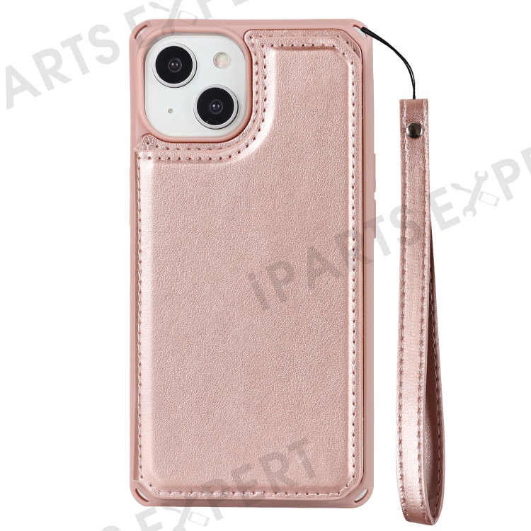 For iPhone 14 Plus Card Slots Design Kickstand PU Leather Coated TPU Phone Case Anti-collision Wallet Cover with Strap - Rose Gold