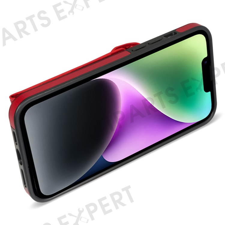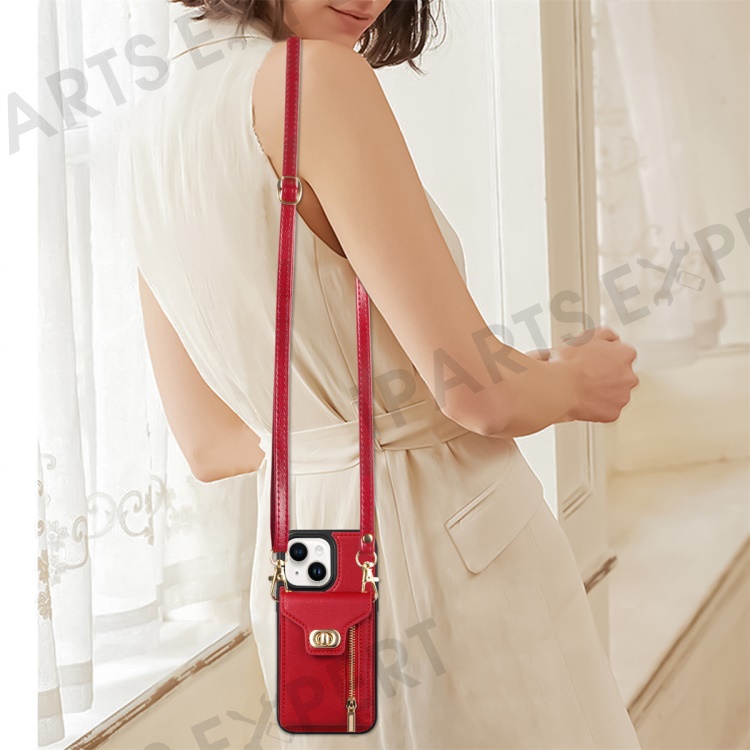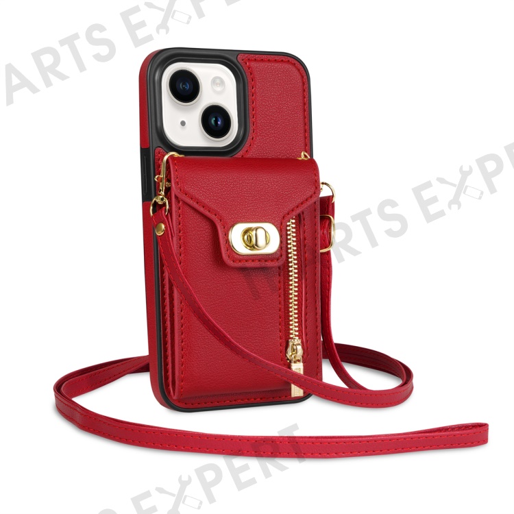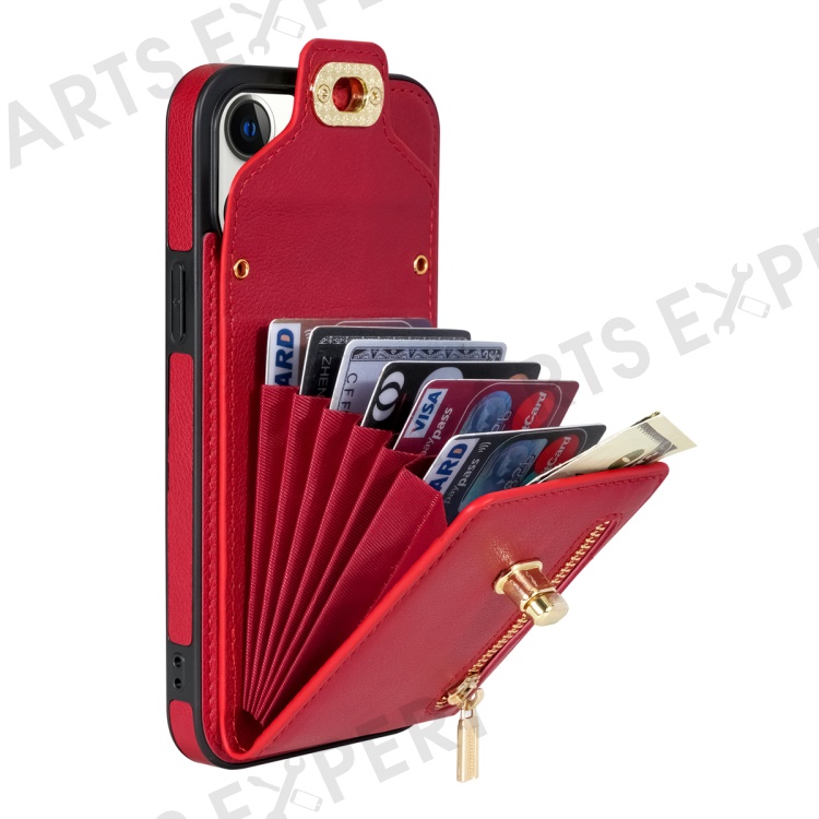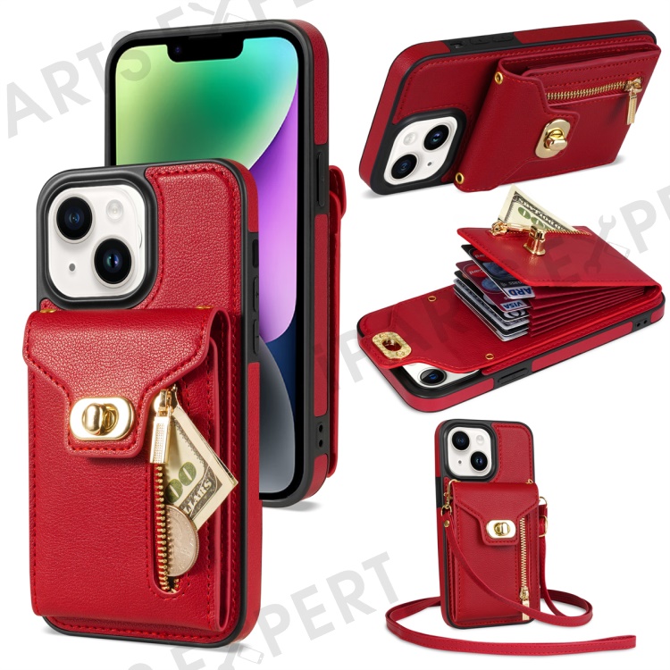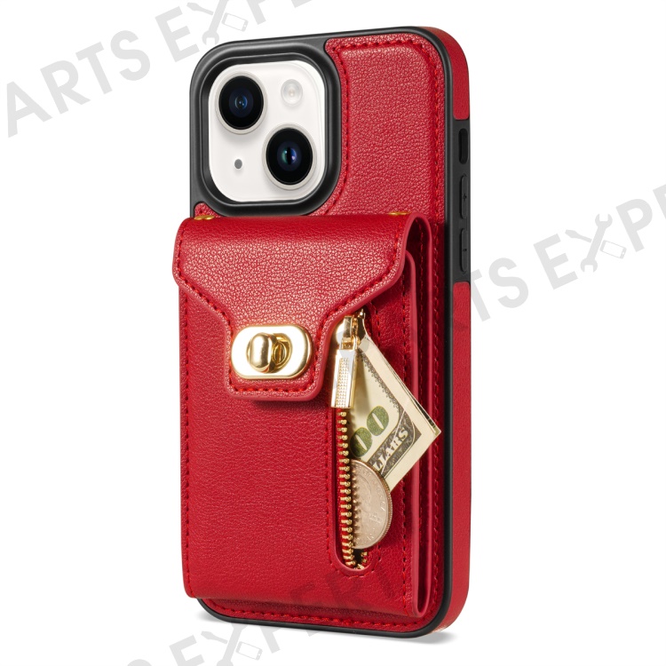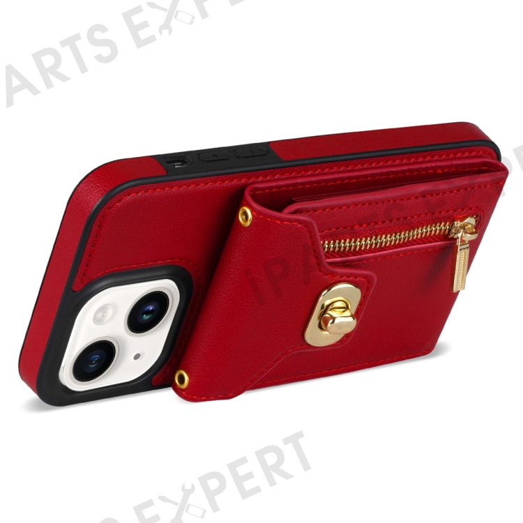 For iPhone 14 Plus Card Slots PU Leather Coated TPU Case Zipper Pocket Phone Cover with Kickstand - Red